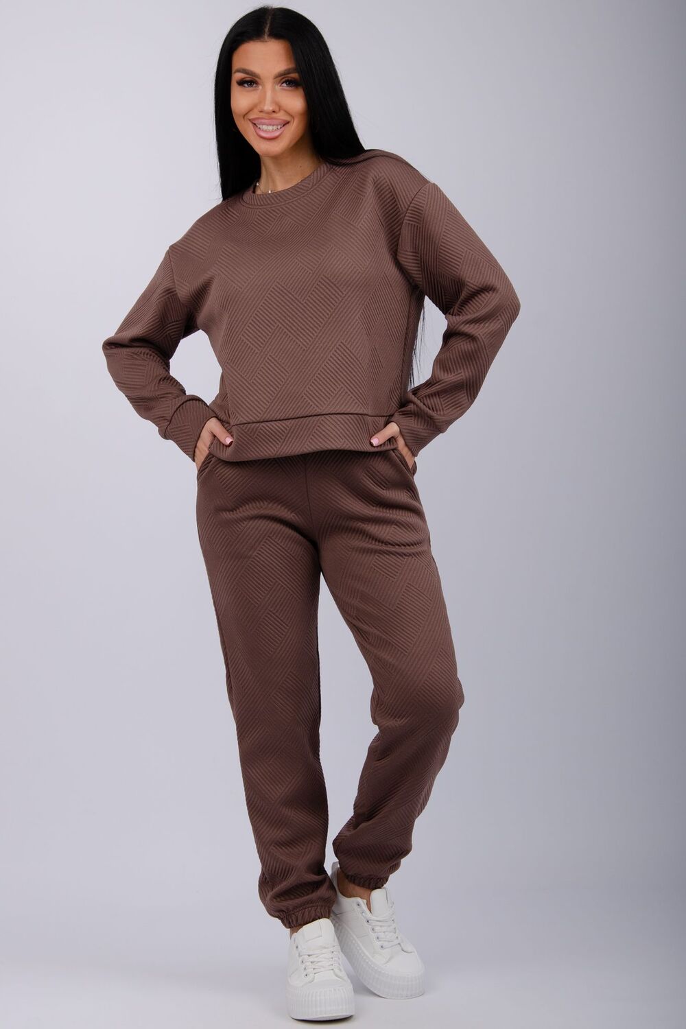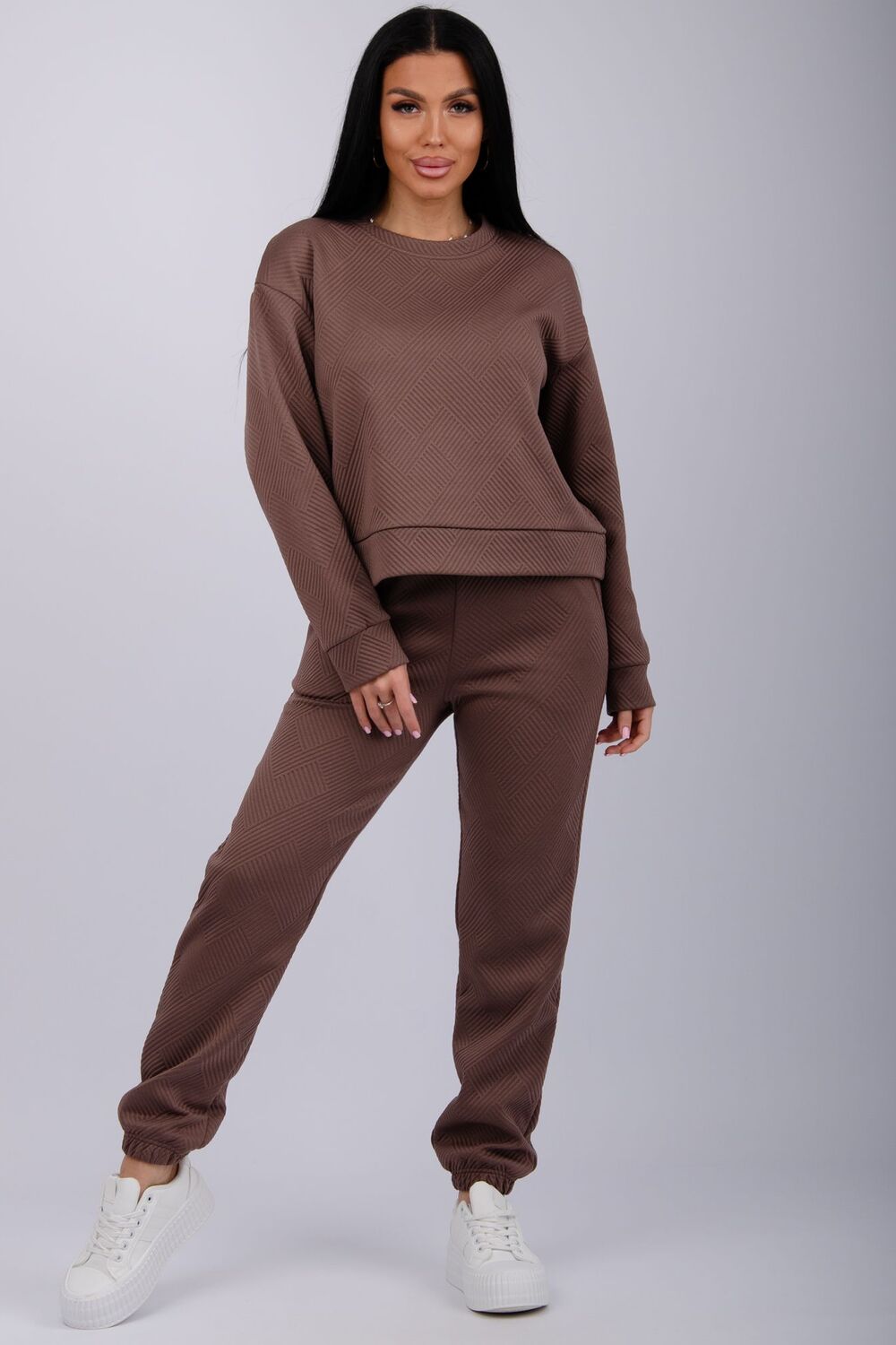 Удобный костюм для повседневной носки и активного отдыха и выхода в свет. Варианты цветов вас приятно удивят: глубокий черный, шоколадный коричневый, серый графит и милый молочный. Верх: джемпер с манжетами на рукавах, низ: прямые брюки на резинке. Приятная фактурная ткань с объёмным геометрическим узором придаст элегантность вашему образу. Костюм легко комбинировать с кроссовками и ботинками. Отличный выбор для осени и зимы. Цвет: серый;коричневый;черный;молоко; Материал: жаккард;жаккард; Состав: 80% полиэстер, 20% хлопок.