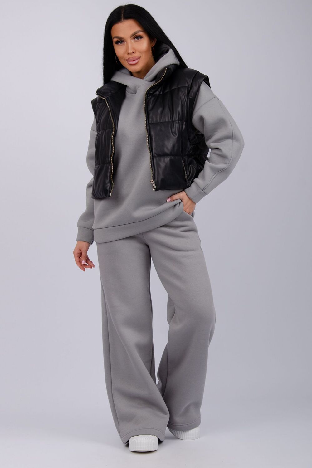 Теплый женский спортивный костюм из плотного футера, который выполнен из 3-х ниточного трикотажного полотна с начесом. Утепленное худи прямого силуэта с втачным спущенным рукавом и капюшоном, брюки палаццо на резинке свободного кроя подходит для прогулок и занятия спортом в прохладную погоду. Благодаря натуральному составу ткани, костюм прекрасно подходит для прохладной погоды, он выполнен из мягкого хлопка с лицевой стороны и с начесом внутри. Цвет: серый;синий;карамель;туман; Материал: футер 3-х нитка с начесом;футер 3-х нитка с начесом; Состав: 80% хлопок, 20% полиэстер.