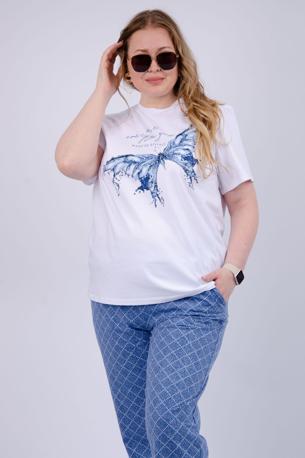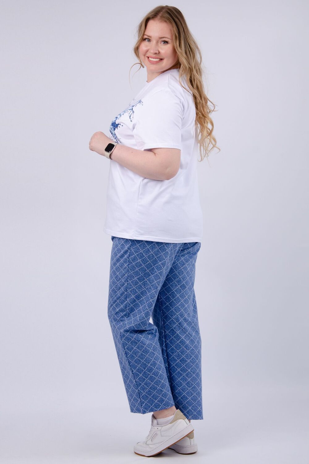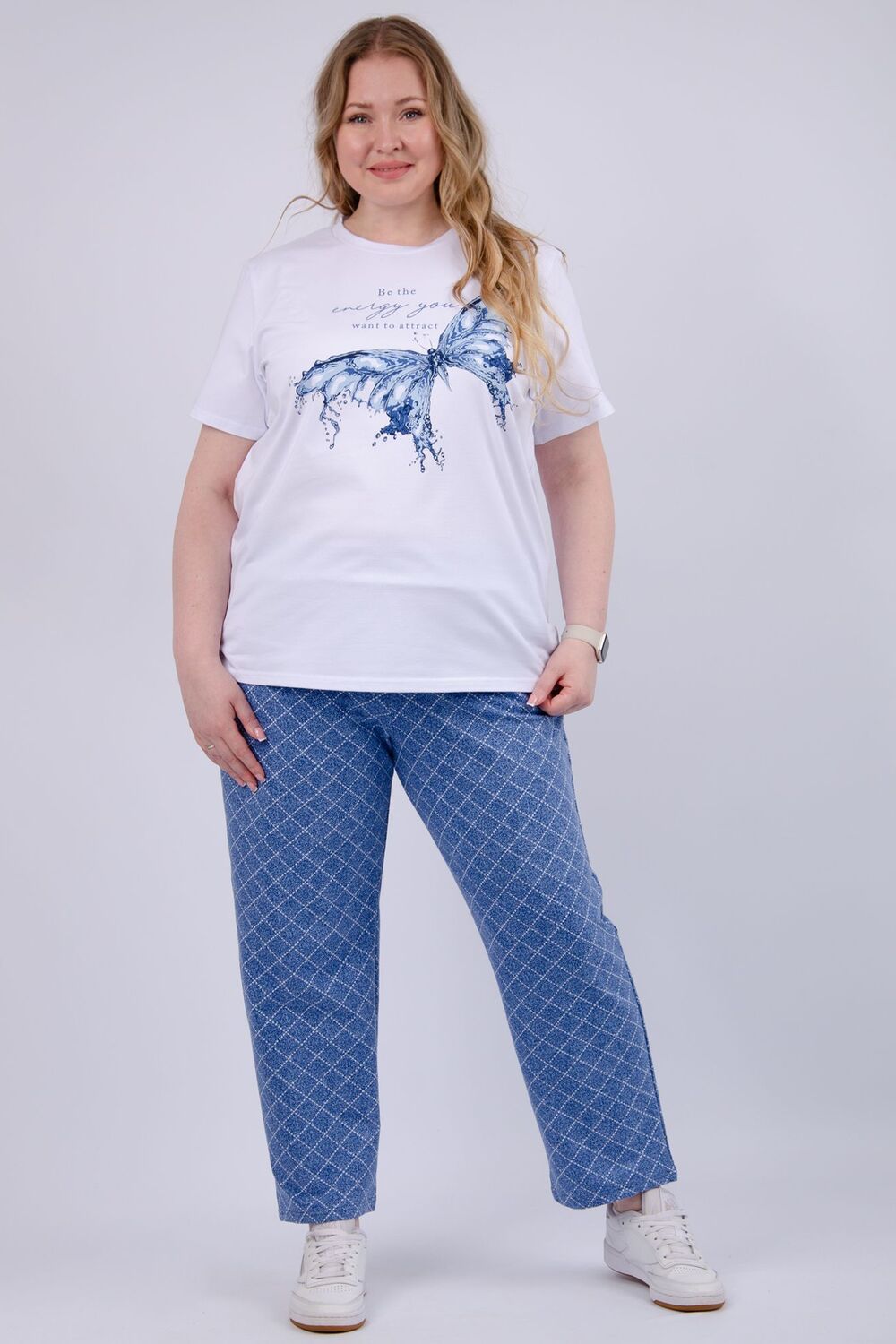 Этот костюм для прогулок настоящая находка как весенний, осенний и летний костюм. В набор входит удобная футболка и брюки, которые подарят ощущение легкости и свободы движений. Мягкая, приятная к телу ткань делает этот комплект идеальным для отдыха, прогулок, путешествий или даже дачных выходных. Стиль сочетает в себе уют и модный тренд. Цвет: белый/синий; Материал: кулирка с лайкрой;футер 2-х нитка;футер 2-х нитка;кулирка с лайкрой; Состав: 95% хлопок, 5% эластан (верх), 100% хлопок (низ).