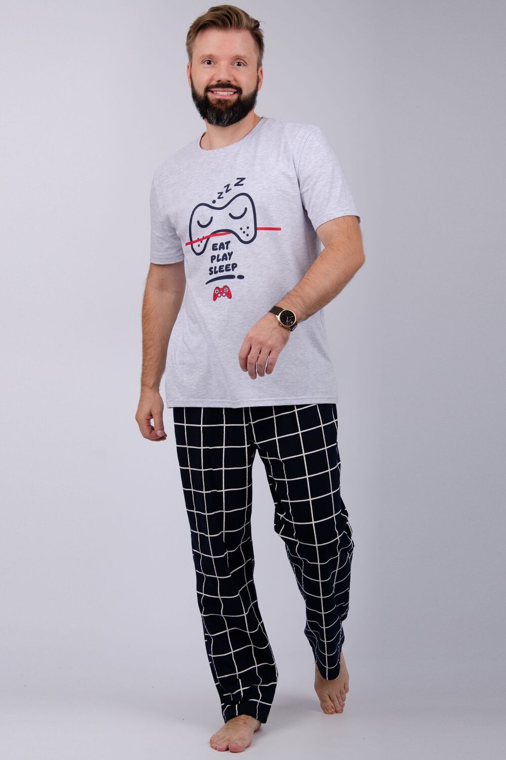 Комфортная мужская пижама из 100% хлопка. Брюки в клетку с боковыми карманами, на эластичном поясе и футболка с коротким рукавом и стильным принтом на полочке. Цвет: темно-синий; Материал: кулирка;кулирка; Состав: 80% хлопок, 20% полиэстер.