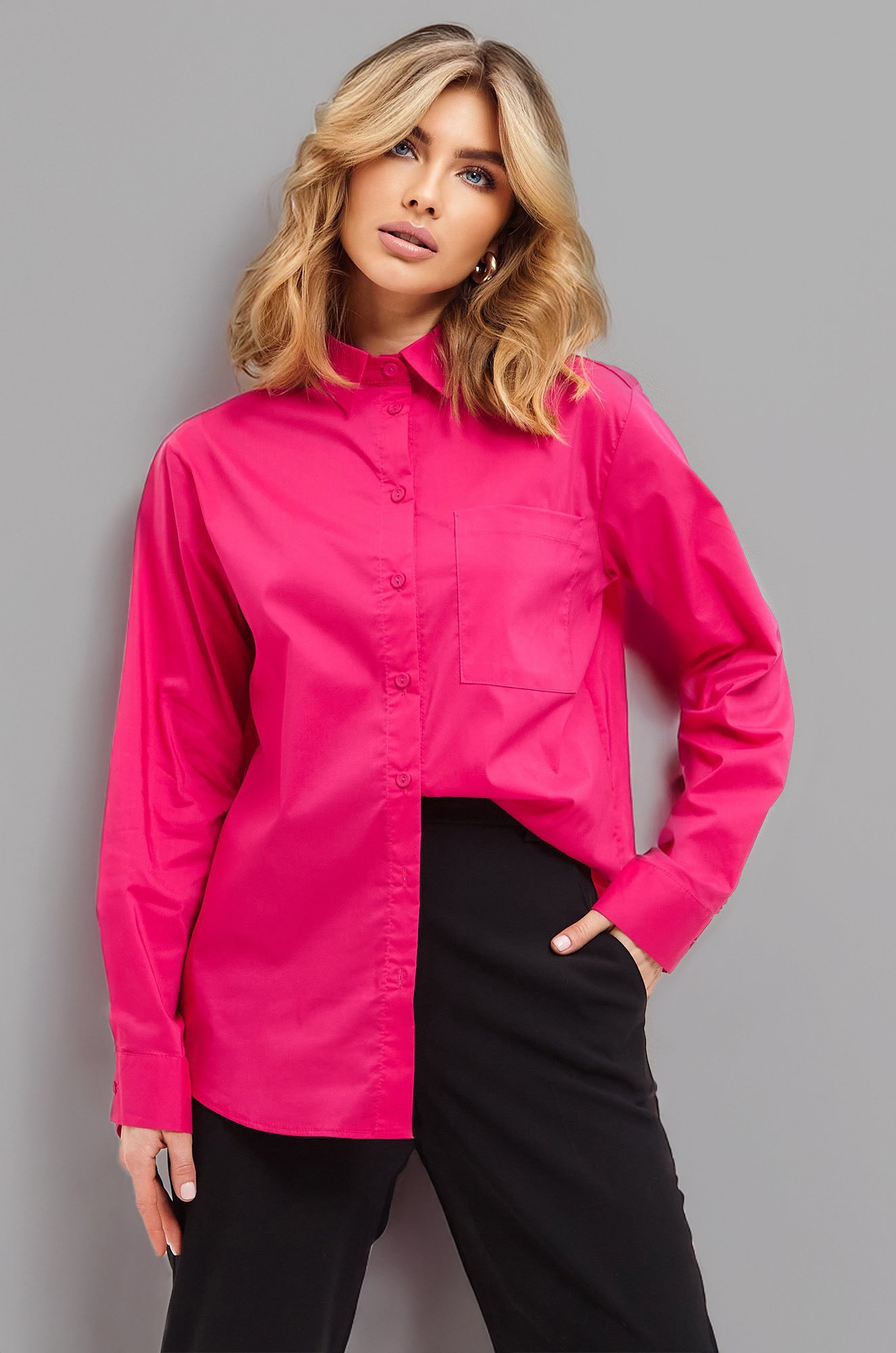 Классическая женская рубашка из батиста малинового цвета — ваш элегантный базовый элемент! Свободный крой с длинным рукавом обеспечивает чувство уверенности и не стесняет движений. Офисную рубашку прямого силуэта универсальной длины можно носить как заправленной, так и навыпуск.