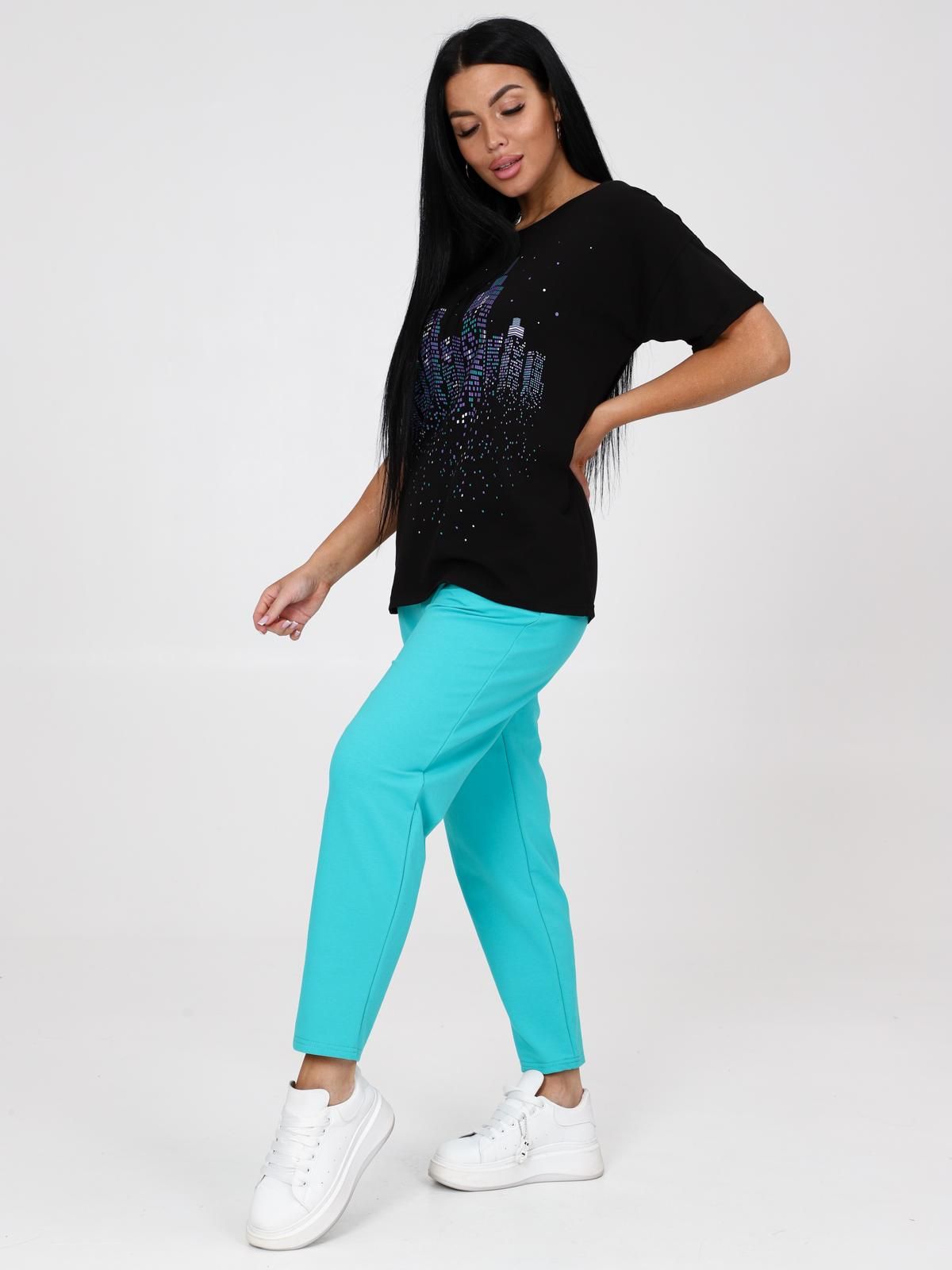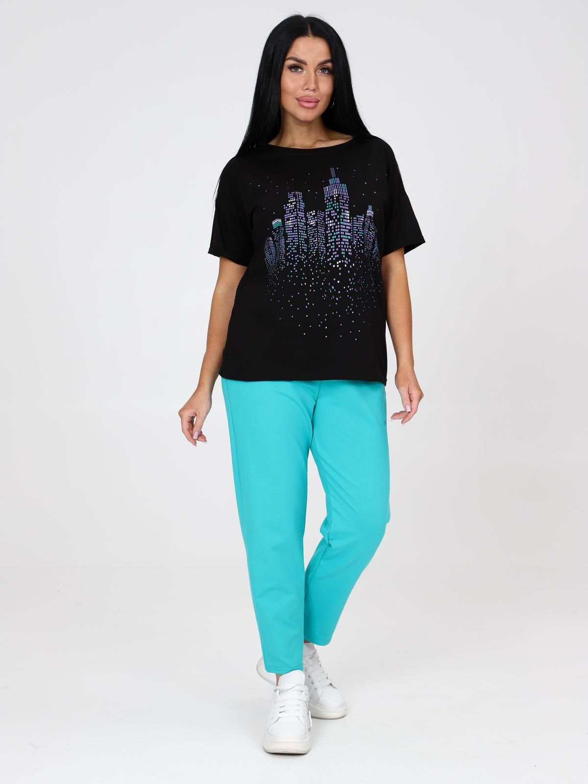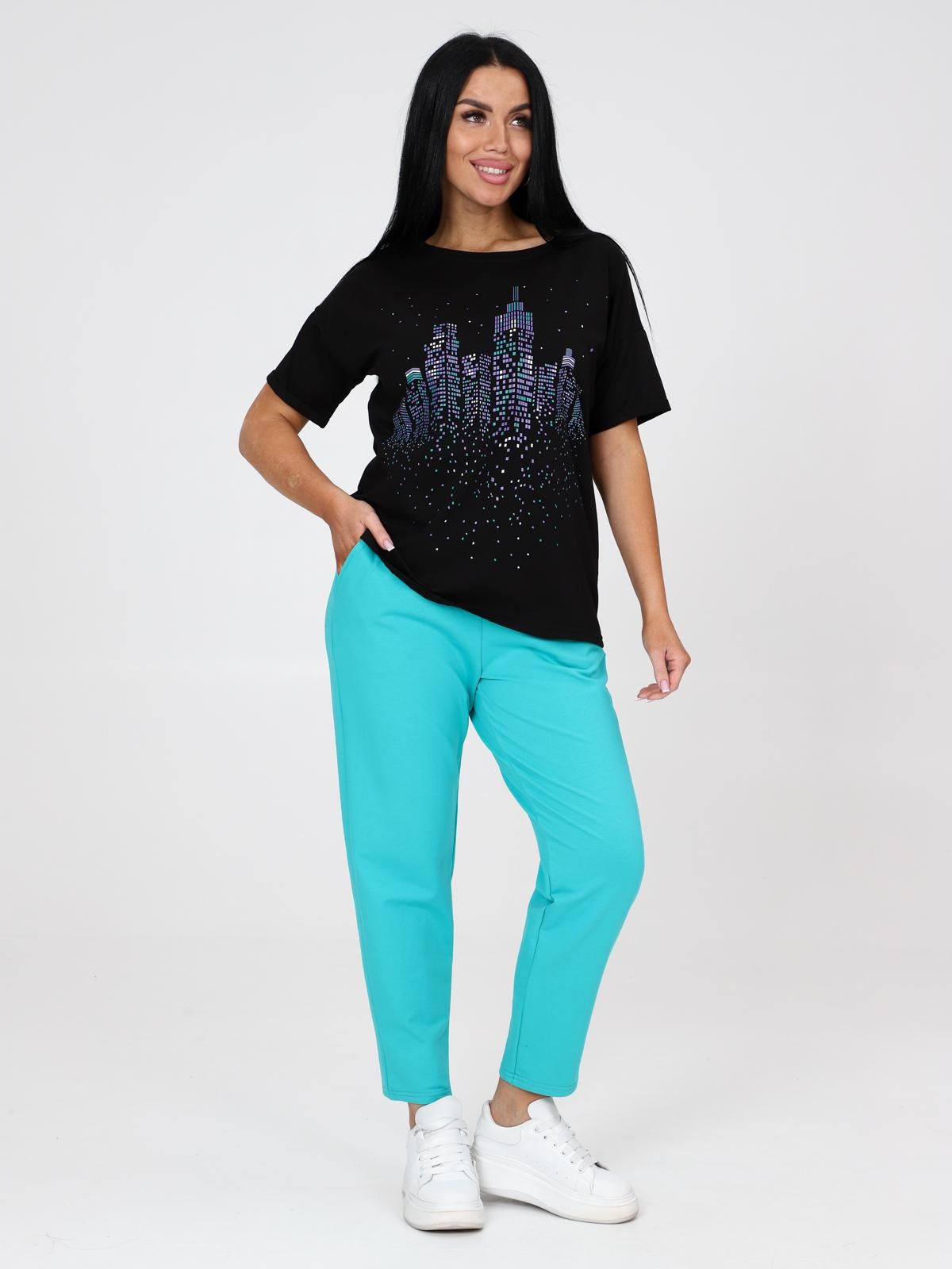 Женский костюм состоит из футболки и брюк. Брюки длиной 7/8 с карманами в боковых швах. Верх на поясе с эластичной тесьмой. Футболка прямого силуэта со спущенной линией плеча. Рукав короткий с отворотиками. Круглый вырез горловины обработан узкой планкой. На центре полочки яркий принт.