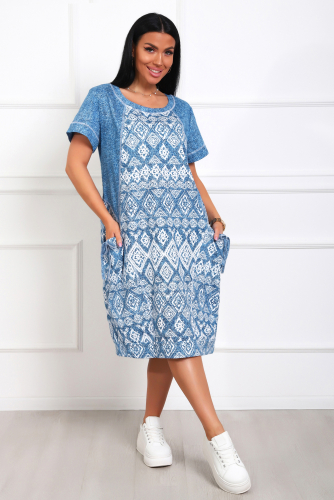 Платье женское из трикотажного полотна. Горловина круглой формы. Линия плеч на естественном месте, рукав короткий. Полочка и спинка резные, с фигурными рельефами и отделочными строчками. На полочке выполнены накладные карманы. По низу изделия притачной пояс. Длина ниже колена.