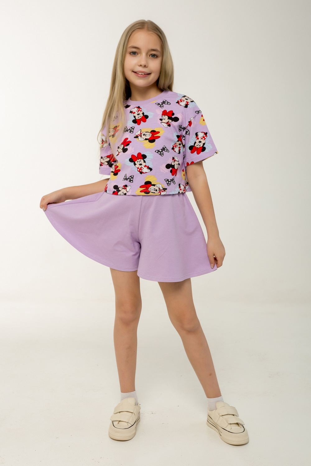 Этот яркий и стильный костюм станет отличным выбором для жаркого лета! Комплект включает укороченный топик свободного кроя с короткими рукавами и шорты-юбку трапециевидного силуэта на поясе с резинкой. Топик выполнен в насыщенном сиреневом оттенке с забавным рисунком любимого персонажа Минни Маус. Шорты-юбка изготовлены из однотонной ткани в тон основного цвета комплекта, что создает гармоничный и законченный образ. Оба элемента костюма сделаны из петельчатого фетера, который прекрасно дышит и обеспечивает комфорт даже в самые жаркие дни. Такой комплект идеально подойдет для повседневных прогулок, отдыха на пляже, а также для детского сада. Каждый элемент можно носить отдельно, сочетая с другой одеждой и создавая новые интересные образы. Костюм сертифицирован и произведен на фабрике Мариша, известной своим высоким качеством продукции.
