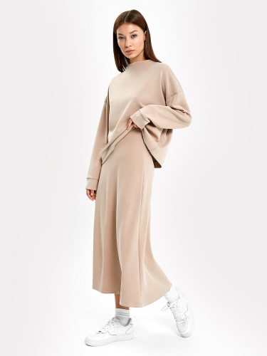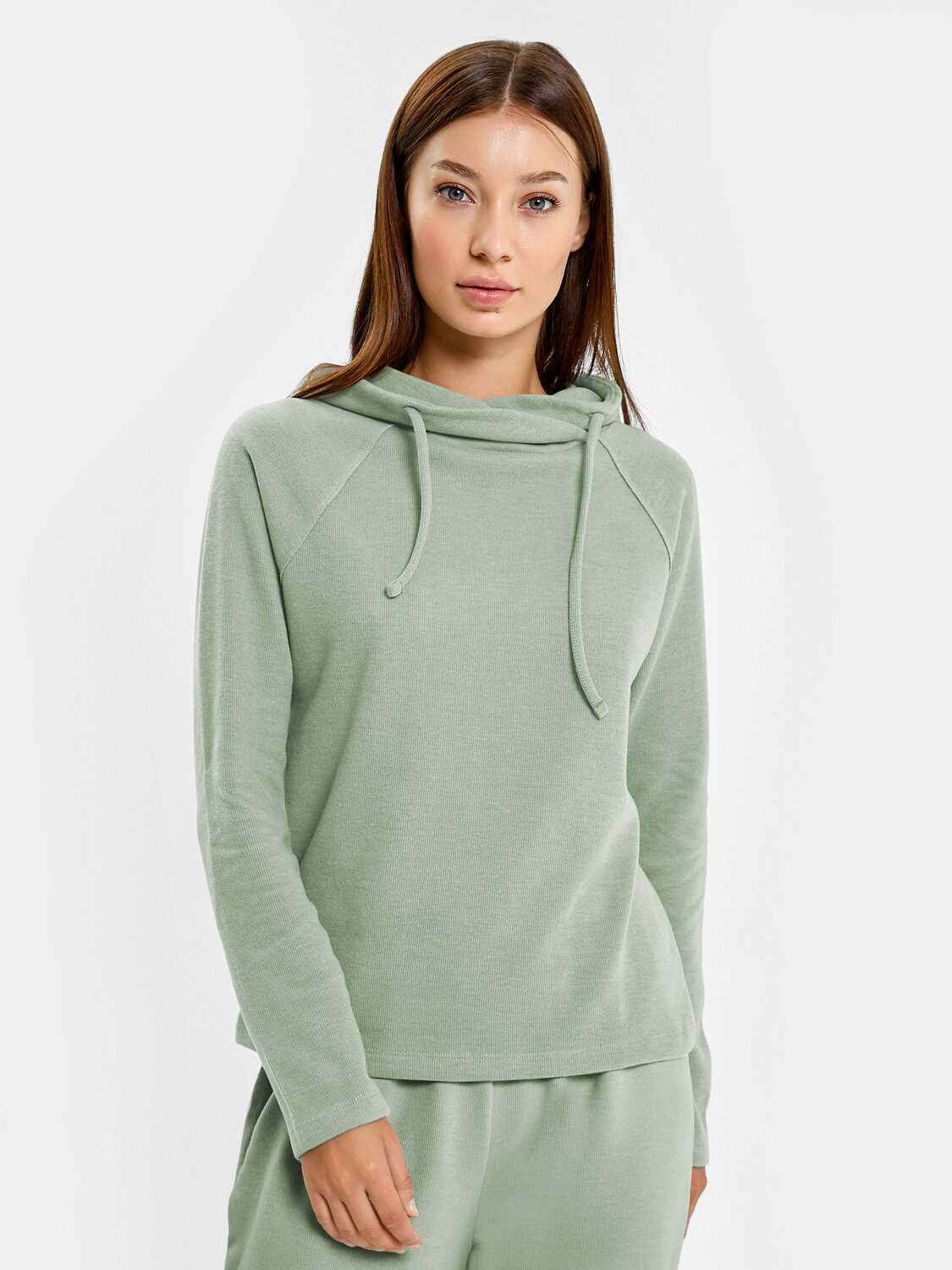 Домашний джемпер прямого силуэта из трикотажного полотна. Длинные рукава "реглан". Круглая горловина с уютным воротником и длинными шнурками-завязками.