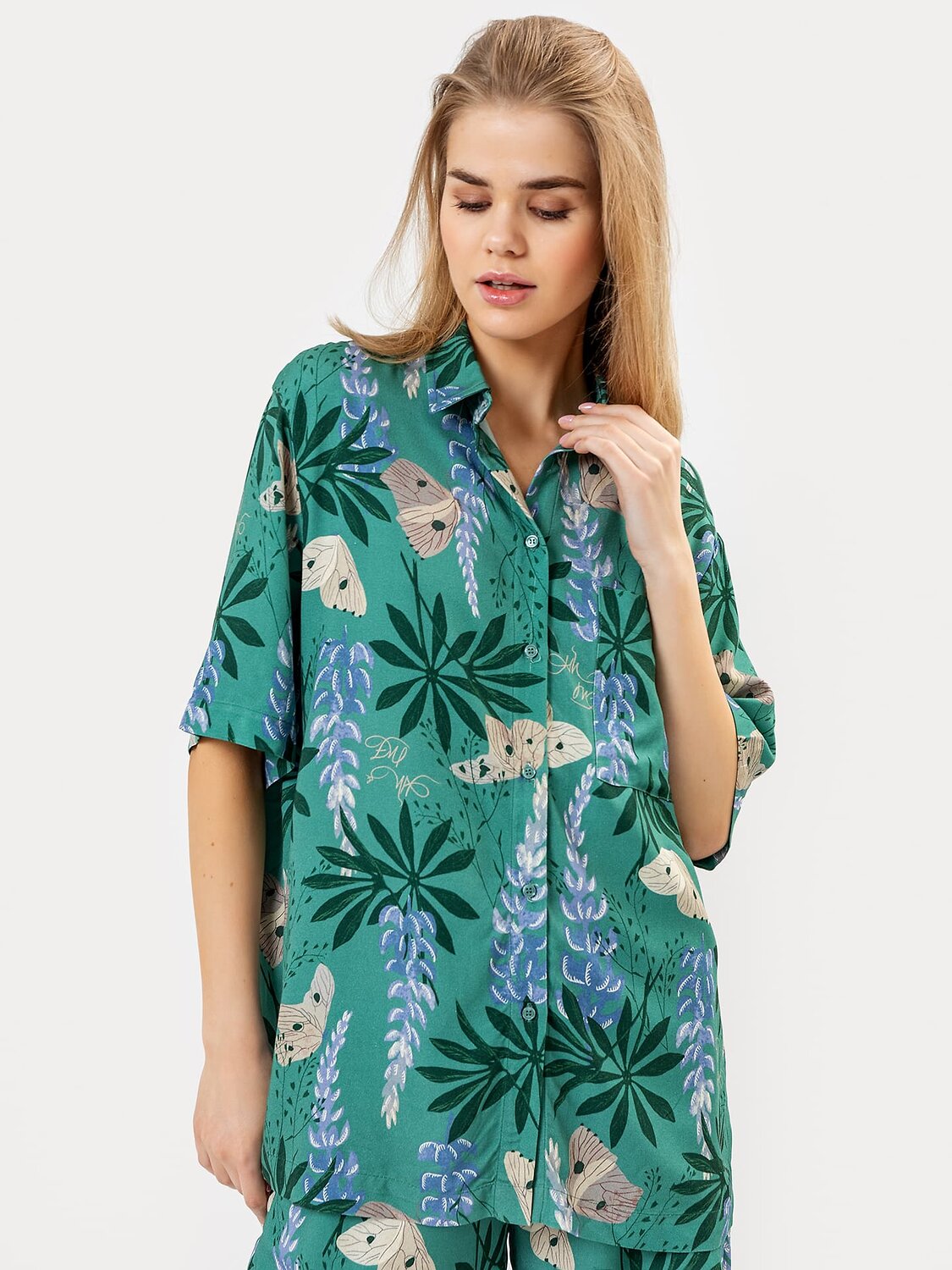 Блузка женская свободного силуэта из ткани. Блузка с цельнокроеной планкой и центральной застежкой на пуговицы. На левой детали переда накладной карман.