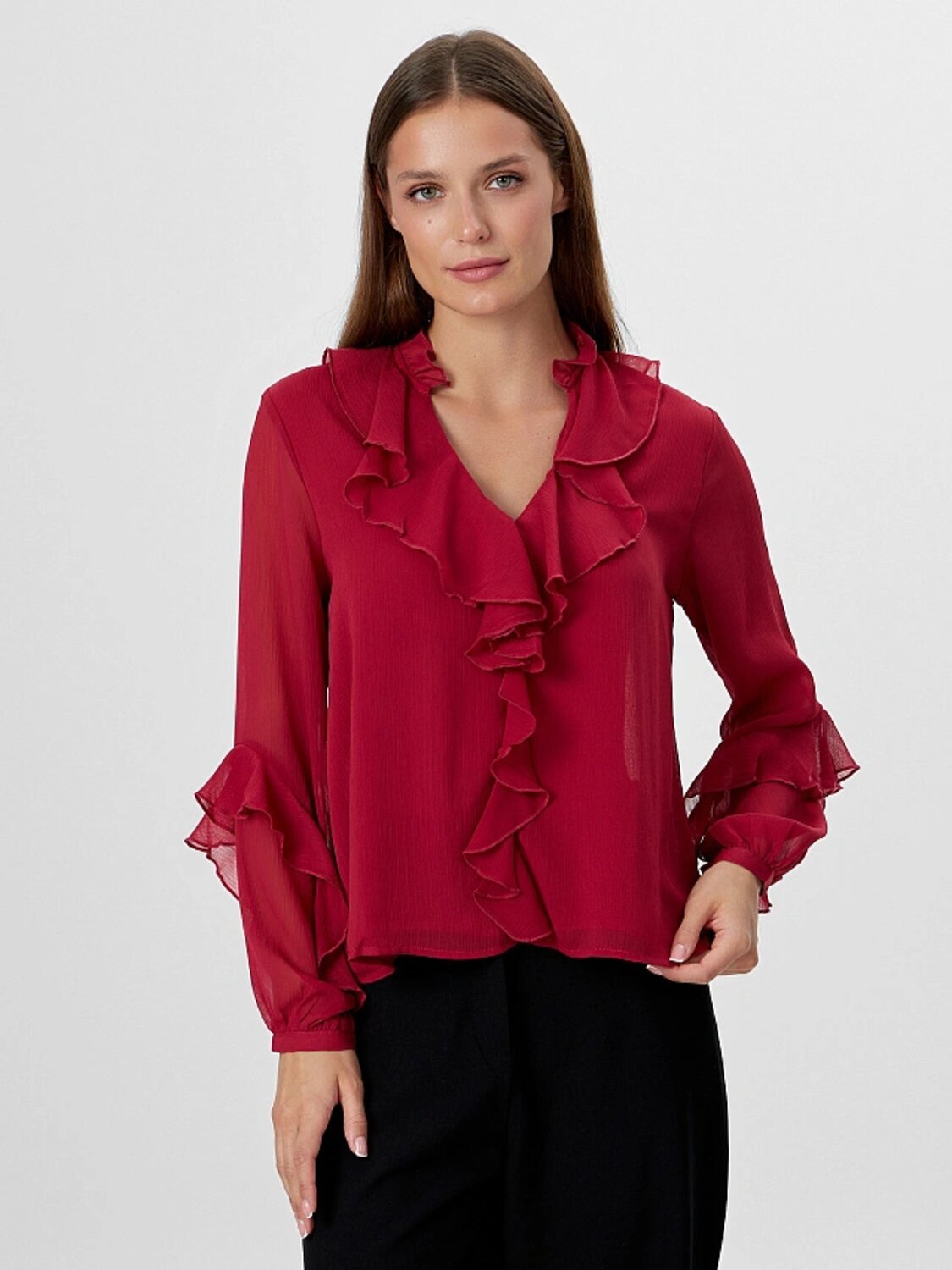 Если вы ищете, где купить женскую блузку, которая не мнется, сохраняет цвет и безупречно выглядит в течение всего дня, эта модель станет отличным выбором. Насыщенный бордовый цвет придает образу глубину и уверенность, а универсальный дизайн подходит для разных случаев.