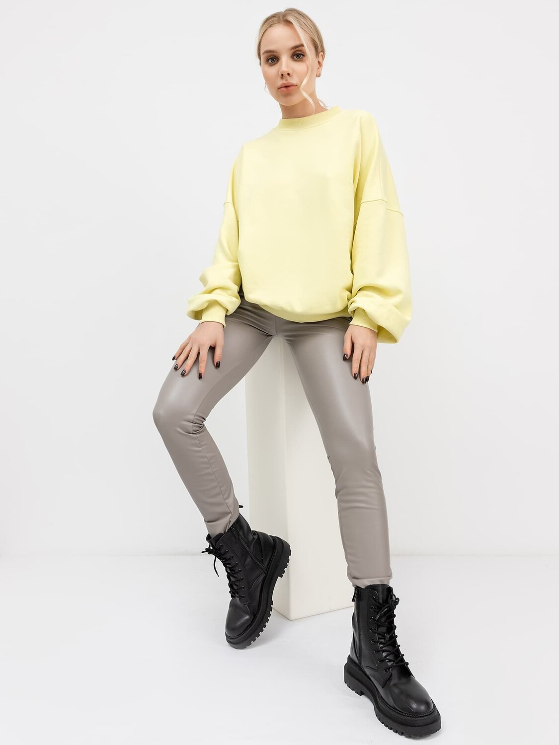 Брюки прилегающего силуэта из экокожи. Длинна классическая. Линия талии значительно завышенная. Вытачки на задней части формируют современный крой. На уровне колена – вертикальный шов. Пояс на жаккардовой эластичной резинке. Хит продаж!