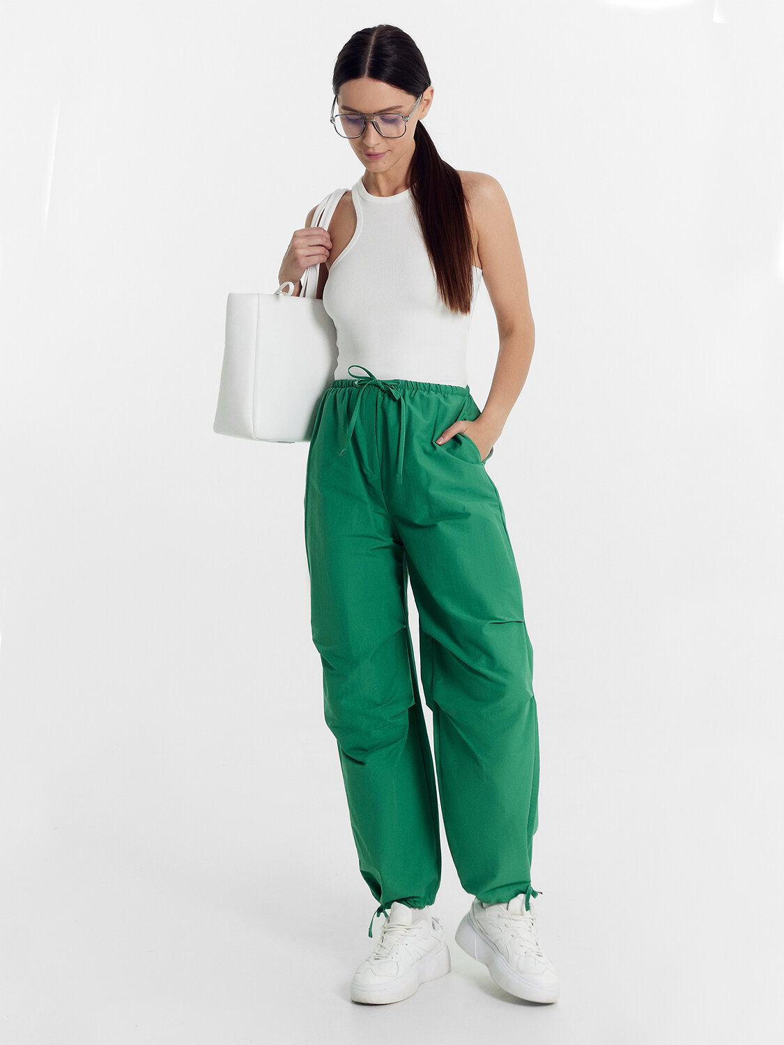 Брюки женские свободного силуэта из ткани.