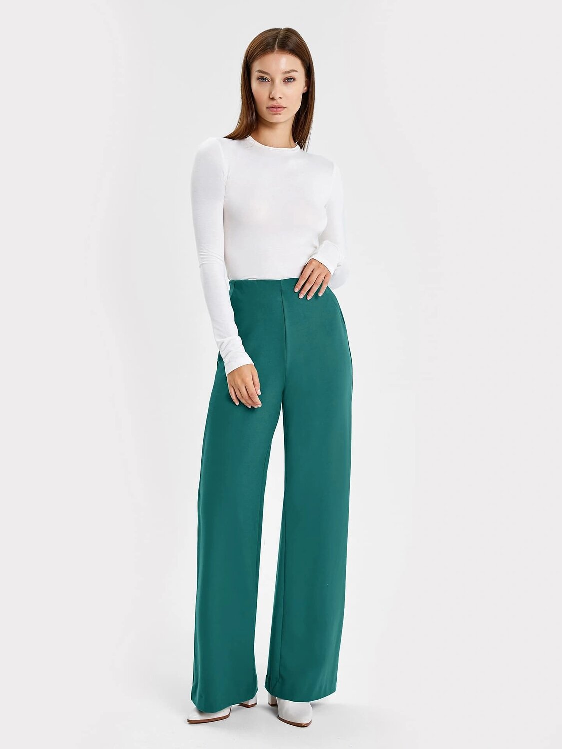 Брюки женские прямого силуэта из трикотажного полотна интерлок. Пояс цельнокроенный на жаккардовой эластичной тесьме.