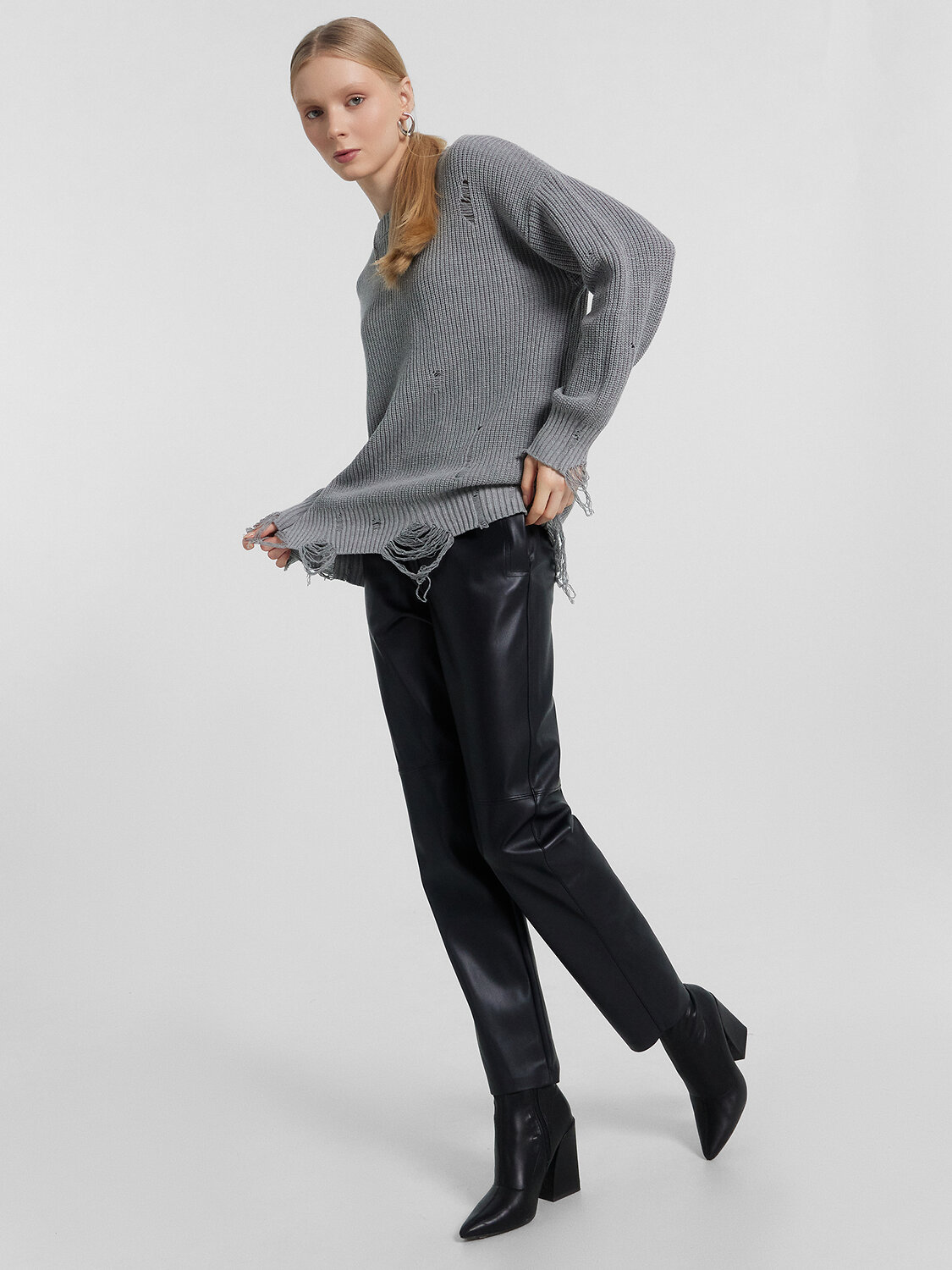 Брюки прямого силуэта зауженные к низу. Пояс цельнокроеный с эластичной тесьмой внутри (внутр. 40мм 40RV). В боковых швах обработаны карманы, подкладка карман из подкладочной ткани. На правой передней половинке проложена декоративная строчка - имитация гульфика. На передних и задних половинках горизонтальные подрезы выше колен. Нижние срезы брюк подкоеены.