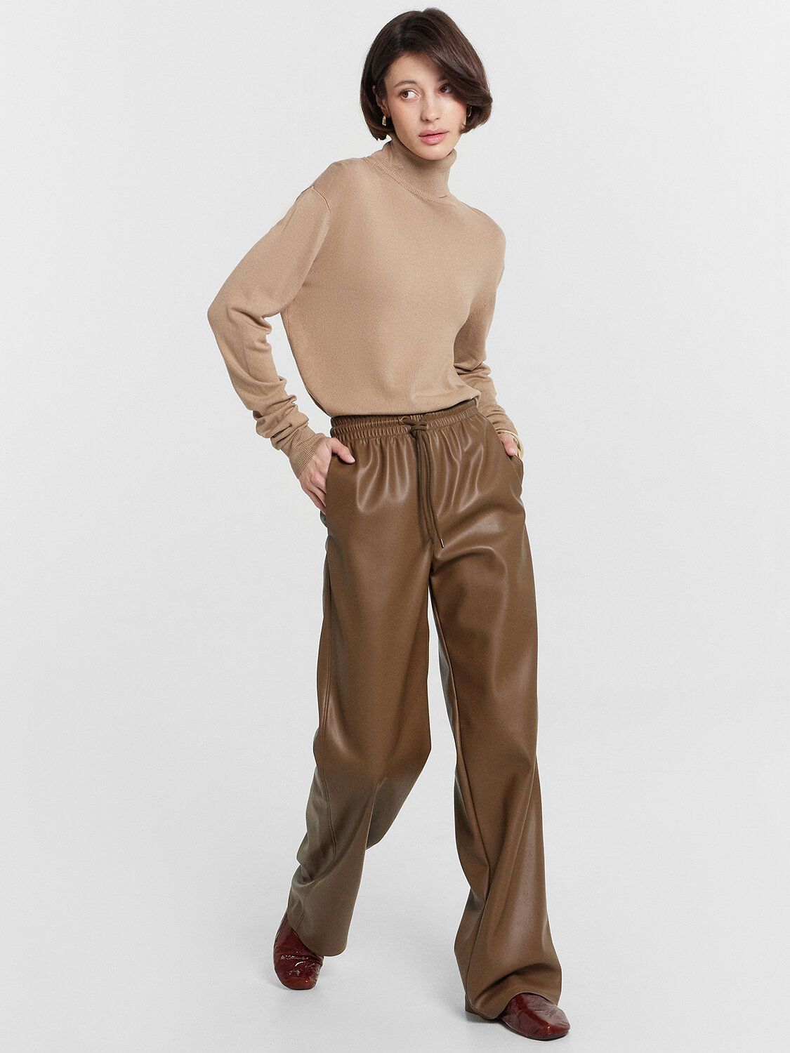 Кожаные брюки - один из наиболее практичных элементов осеннего гардероба! Поэтому наша коллекция не обошлась без стильных брюк из искусственной кожи, отличающиеся высоким качеством, а также стойкостью к растрескиванию и износу. Прямой крой, высокая посадка, удобные боковые карманы и эластичный пояс со шнурком обеспечивают идеальную посадку и комфорт в носке. В этих стильных брюках из искусственной кожи от Mark Formelle вы будете чувствовать себя уверенно и стильно в любой ситуации!