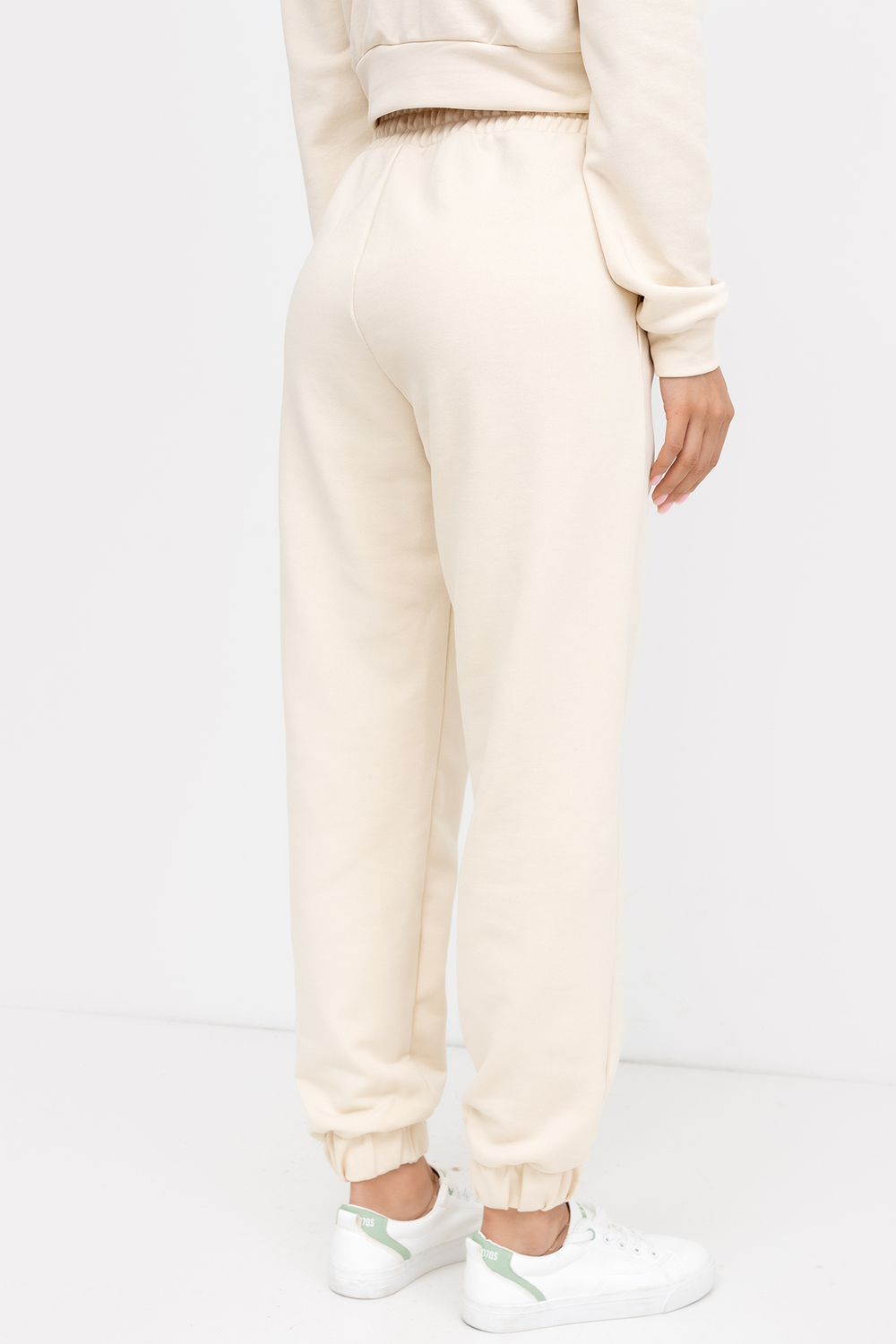 Женские брюки-джоггеры из легкого трикотажного футера без подчеса. Силуэт свободный, максимально расслабленный. Есть удобные боковые карманы. Пояс с эластичной тесьмой внутри. Брюки завершаются манжетами с эластичной тесьмой внутри. Стильные брюки для модных городских образов! Цвет: молочный; Материал: футер 2-х нитка;футер 2-х нитка; Состав: 20% полиэстер / 80% хлопок.