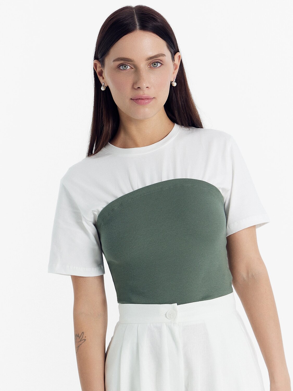 Джемпер с отрезной деталью «под корсет» из рибаны. Деталь из рибаны прилегающего силуэта.