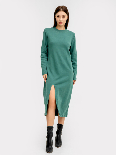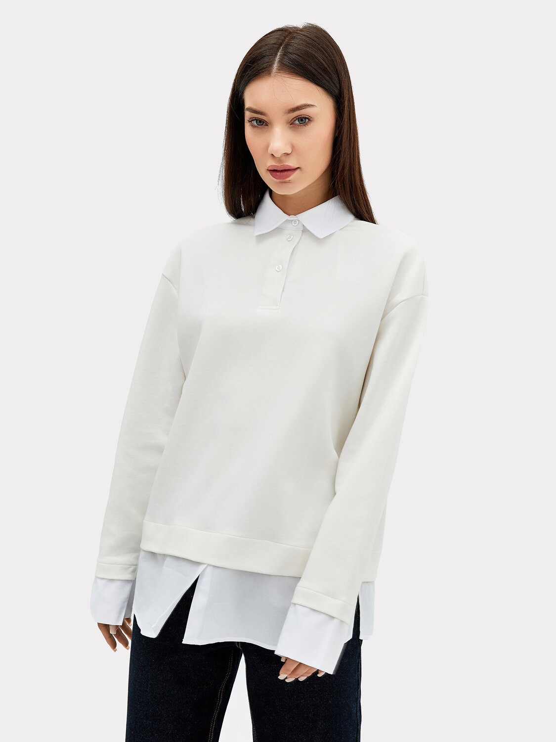 Уютный джемпер свободного кроя из плотного трикотажного полотна - интерлока с отделочными деталями из ткани - поплина. Отделочные детали имитируют выправленную из-под низа изделия рубашку. В боковых швах выполнены разрезы. Горловина обработана отделочным элементом - стояче-отложным воротником с отрезной стойкой. Воротник выполнен из отделочного полотна. На передней детали есть застежка-планка на три рубашечных пуговицы на два прокола на застежке-планке. Плечо спущено, пройма углублена, рукав втачной длинный с манжетами. Стильная и комфортная модель для создания оригинальных образов на каждый день!