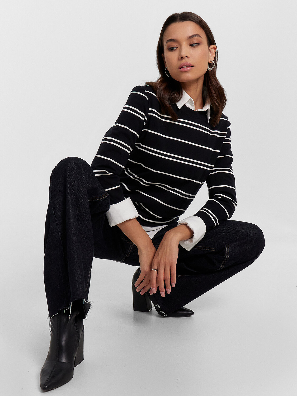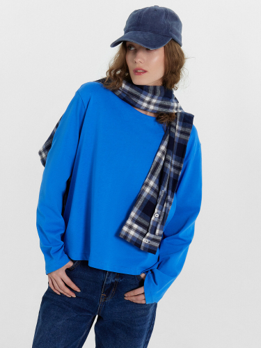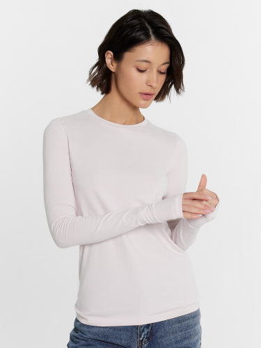 Джемпер женский прямого силуэта из трикотажного полотна кулирка. Горловина круглой формы, широкая обтачка из рибаны. Рукав втачной, длинный. Подгибки низа и рукава широкие.