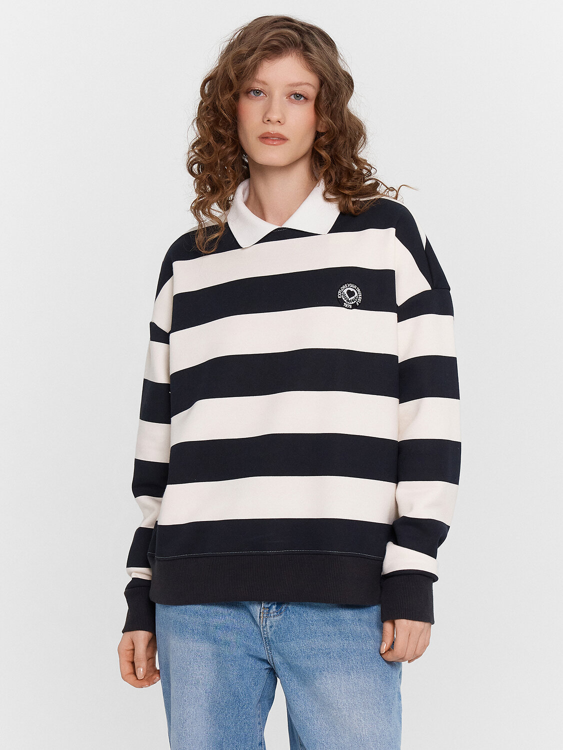 Женский джемпер оверсайз станет идеальным дополнением вашего современного гардероба. Горловина круглой формы с отложным воротником придает изделию элегантный вид, а спущенная линия плеча и углубленная пройма создают стильный и расслабленный силуэт. Длинные объемные рукава с манжетами добавляют комфорт, обеспечивая уют в прохладные дни. Изготовленный из футера с подчесом, джемпер гарантирует мягкость и тепло, делая его идеальным выбором для создания стильных и современных образов.