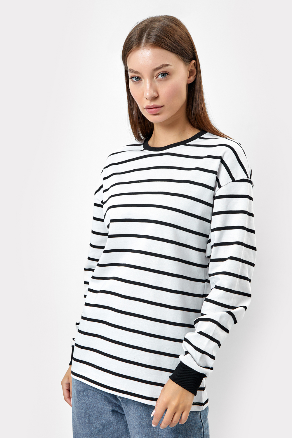Джемпер женский из качественного хлопка, свободного силуэта. Вырез круглый, рукава длинные на манжетах. Спущенная линия плеча и углубленные проймы не сковывают движений. Отличный базовый вариант на каждый день. Цвет: Молочная полоска; Материал: кулирка;кулирка; Состав: 100% хлопок.