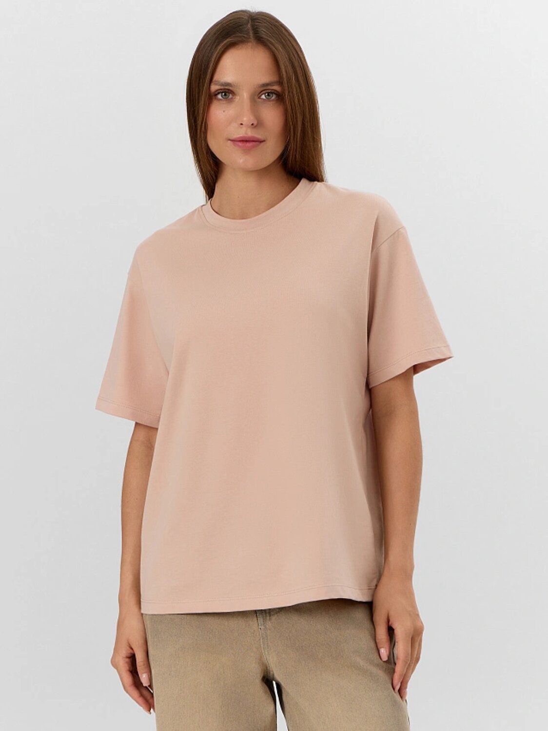 Элегантность в простоте — женская футболка для вашего базового гардероба. Модель свободного силуэта станет основой для множества стильных образов. Она выполнена из мягкой и дышащей хлопковой кулирки, что делает ее идеальным выбором для повседневного ношения. Круглая горловина придает аккуратный вид, а спущенная линия плеча и углубленная пройма обеспечивают свободу движений. Широкие рукава, длиной чуть выше локтя, придают изделию современный и непринужденный вид. Эта футболка идеально сочетается с джинсами, шортами или юбкой, позволяя вам создавать как повседневные, так и более элегантные образы. Стильная удобная и универсальная — незаменимый элемент вашего гардероба!