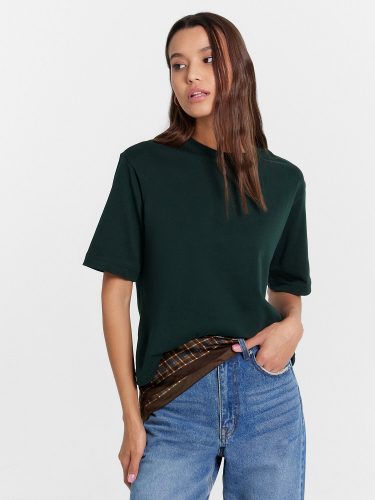 Нижние срезы футболки и рукавов обработаны швом вподгибку.