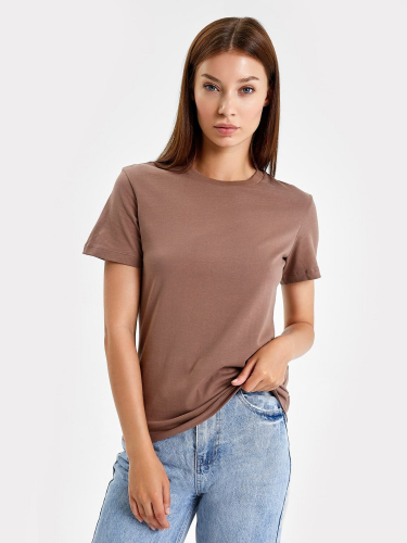 Футболка прямого силуэта из трикотажного полотна кулирка. Горловина круглой формы, широкая обтачка из рибаны.