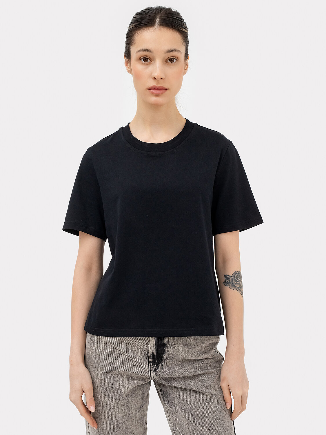 Футболка прямого силуэта из трикотажного полотна кулирка. Горловина круглой формы, широкая обтачка из рибаны.