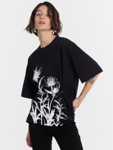 Эта женская футболка оверсайз со стразами станет ярким акцентом вашего гардероба. Выполненная из хлопковой кулирки, она сочетает в себе комфорт и стиль. Кулирка - это мягкий, прочный и воздухопроницаемый материал, отличающийся особой износостойкостью. Футболка имеет круглую горловину и спущенное плечо, а широкий рукав длиной чуть выше локтя добавляет модели стильный объем. Удлиненный силуэт делает эту модель идеальной для создания современных и удобных образов. Такой стильный и комфортный элемент одежды прекрасно подойдет для повседневной носки, добавляя блеска вашему образу. Рекомендуем!