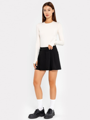 Горловина округлой формы обработана обтачкой из рибаны. Рукава втачные короткие.