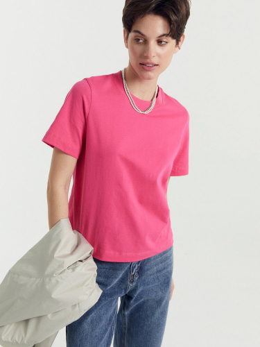 Нижние срезы футболки и рукавов обработаны швом вподгибку.