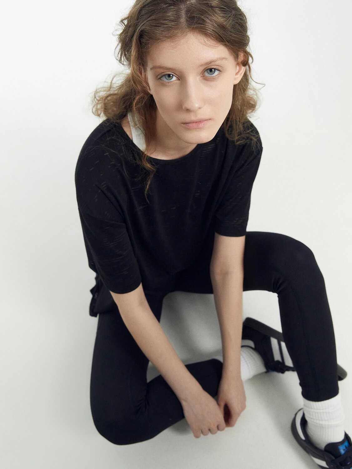 Нижний срез футболки и рукавов обработан швом вподгибку.
