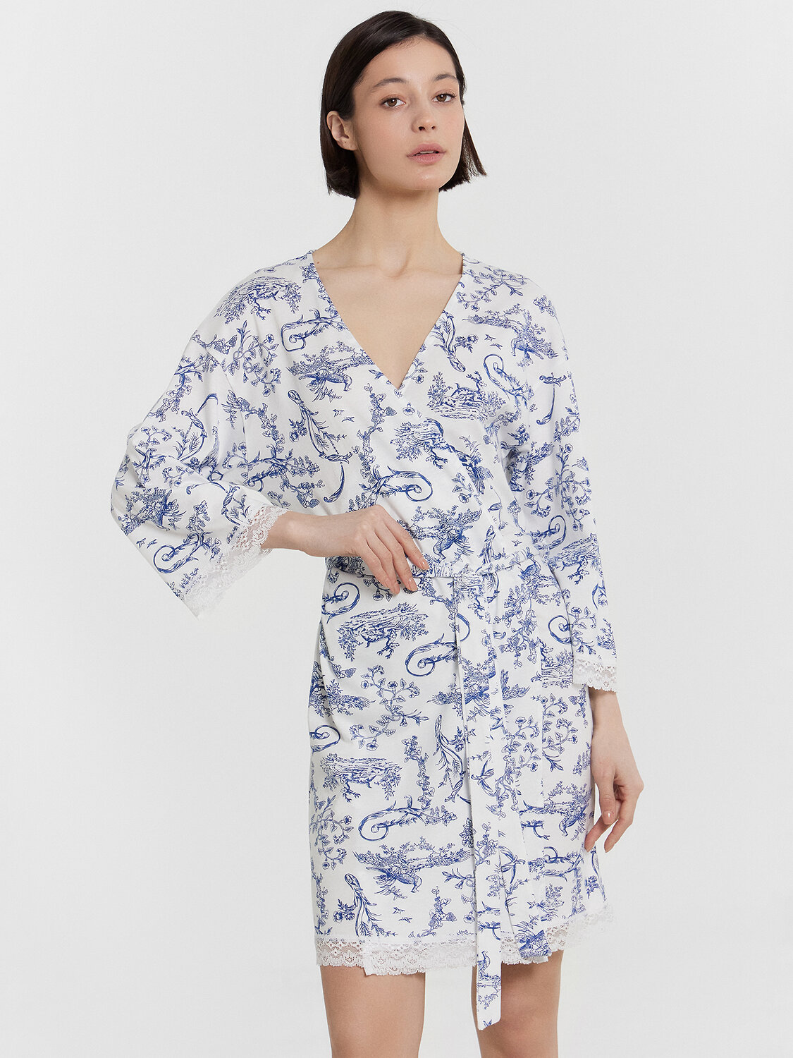 Халат прямого силуэта, длина до колен. Спинка цельнокроеная. Халат с запахом, со съемным поясом, продетым в шлевки в боковых швах. На уровне талии притачены завязки для дополнительной фиксации левой полы халата. Концы пояса свободно завязываются. Рукава длинные. Срезы борта и горловины.