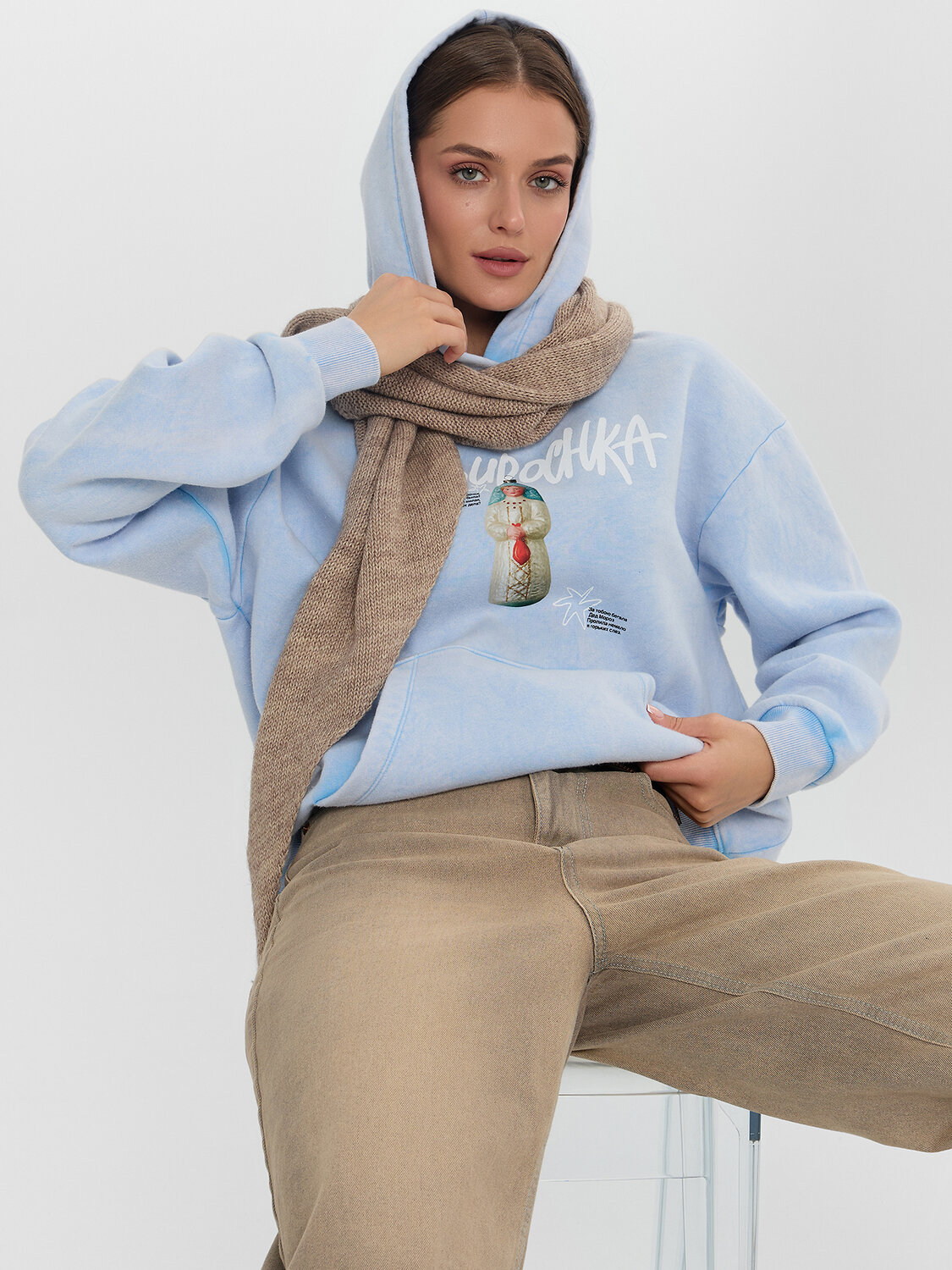 Голубое теплое худи с надписью «Снегурочка» создано для уютных зимних дней. Модель свободного оверсайз кроя со спущенным плечом обеспечивает комфорт и современный силуэт. Просторный капюшон и вместительный карман-кенгуру добавляют практичности в повседневной носке.