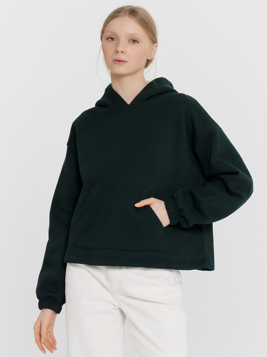 Женское укороченное худи свободного силуэта станет идеальным дополнением вашего гардероба. Модель с круглой горловиной и капюшоном обеспечивает современный и стильный вид. Длинные рукава с эластичными манжетами и спущенное плечо добавляют комфорт и непринуждённость. А накладной карман «кенгуру» спереди делает изделие практичным и удобным для хранения мелочей. Нижний срез аккуратно обработан швом вподгибку, что обеспечивает стильный завершенный вид. Худи, выполненное из мягкого футера с подчесом, подарит вам тепло и уют в прохладную погоду.