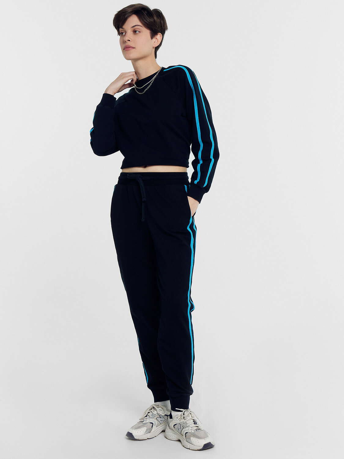 Спортивный комплект из футера без подчеса. В составе полотна – натуральный хлопок, немного полиэстера для прочности и эластана, который дарит свободу движений при нагрузках. Джемпер прямого силуэта, с длинными рукавами на манжетах, эластичным поясом на нижнем срезе и лампасами. Брюки зауженного к низу силуэта, на манжетаха, с лампасами и боковыми карманами. Широкий пояс из рибаны со шнурком-завязкой дарит особый комфорт во время занятий спортом и отдыха.