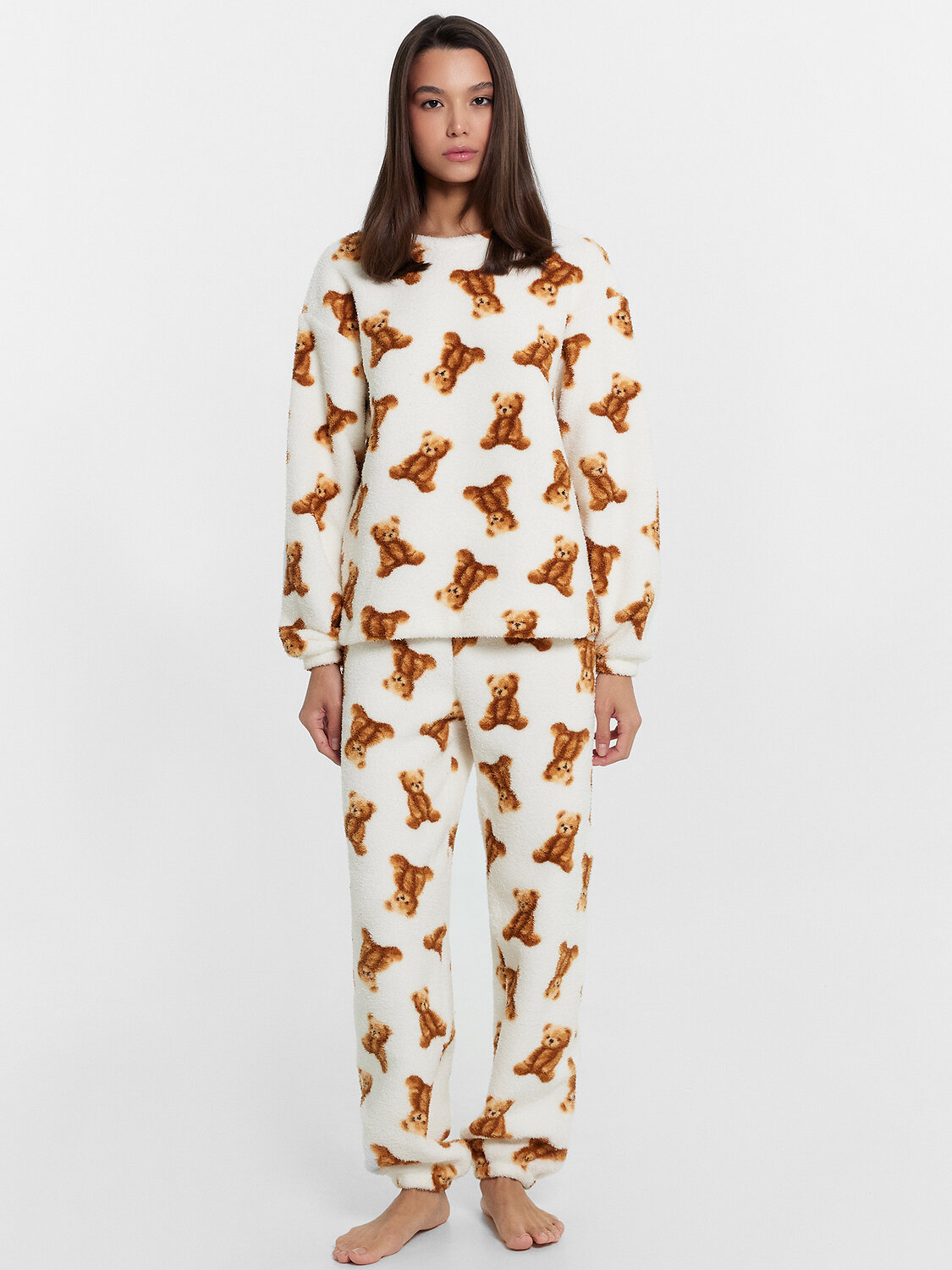 Невероятно мягкая женская пижама подарит ощущение плюшевой нежности и комфорта. Свободный джемпер с длинными рукавами на манжетах обеспечивает уют и тепло в прохладные вечера. Длинные свободные брюки, слегка зауженные к низу и завершающиеся эластичной тесьмой, создают идеальную посадку и удобство. Эта пижама станет отличным выбором для комфортного отдыха, создавая атмосферу расслабления и тепла. Подарите себе или близким плюшевый уют с этой прекрасной пижамой!