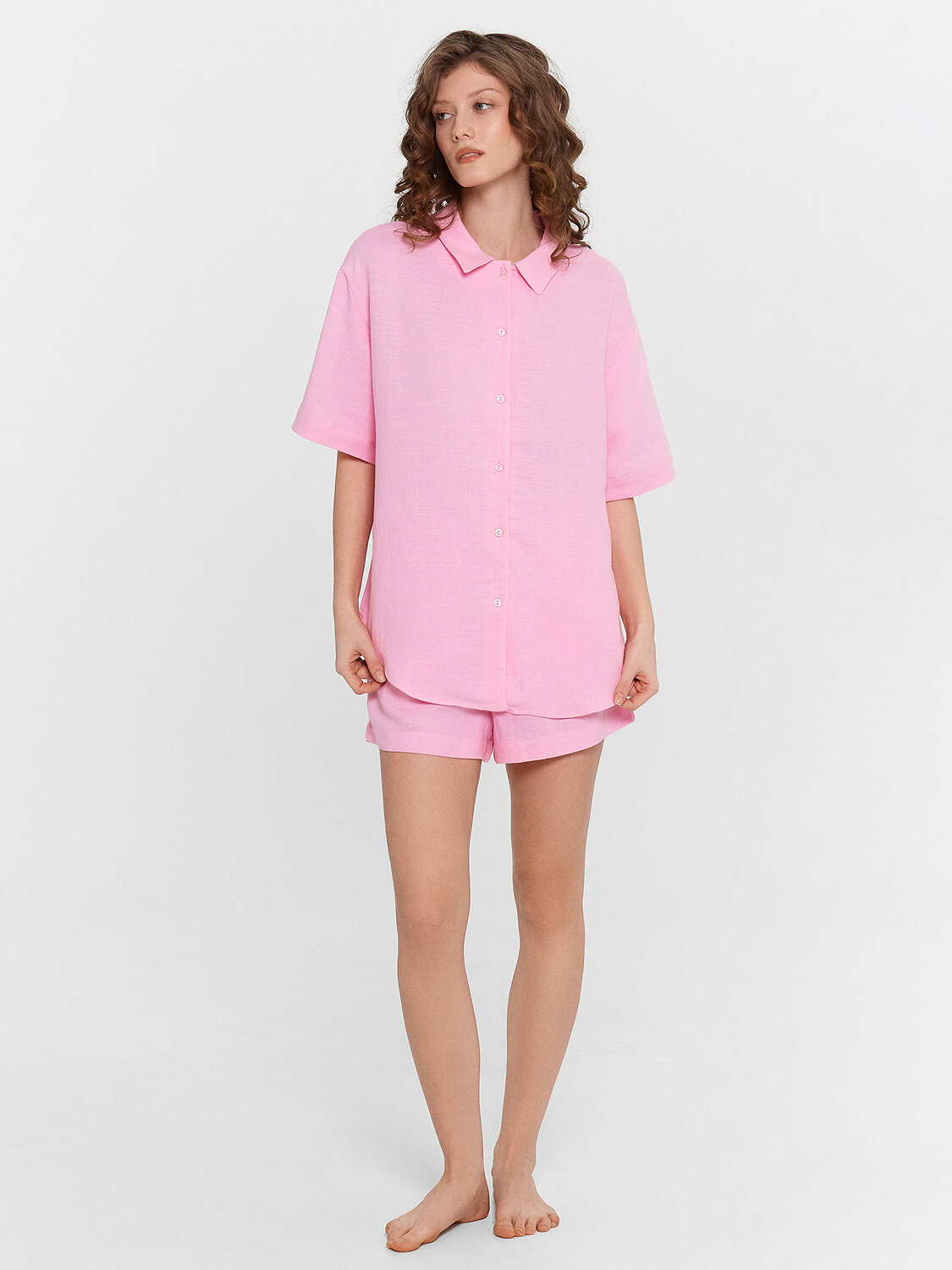 Женская пижама, выполненная из сочетания льна и вискозы. Она сочетает в себе стиль и комфорт, идеально подходя для повседневного ношения дома. Рубашка свободного силуэта с отложным воротником и короткими рукавами имеет центральную застежку на пуговицах, что обеспечивает удобство и легкость в носке. Шорты свободного кроя с высокой посадкой и карманами в боковых швах добавляют практичности и комфорта. Модель выполнена из натурального льна и вискозы. Такое сочетание материалов обеспечивает оптимальный комфорт и долговечность. Лён - это натуральный материал, который обладает отличными дышащими свойствами и дарит прохладу в жаркие дни. Вискоза, в свою очередь, добавляет мягкости и шелковистости, делая изделие особенно приятным к телу. Эта пижама станет вашим любимым выбором для уютных вечеров и расслабленного отдыха дома.