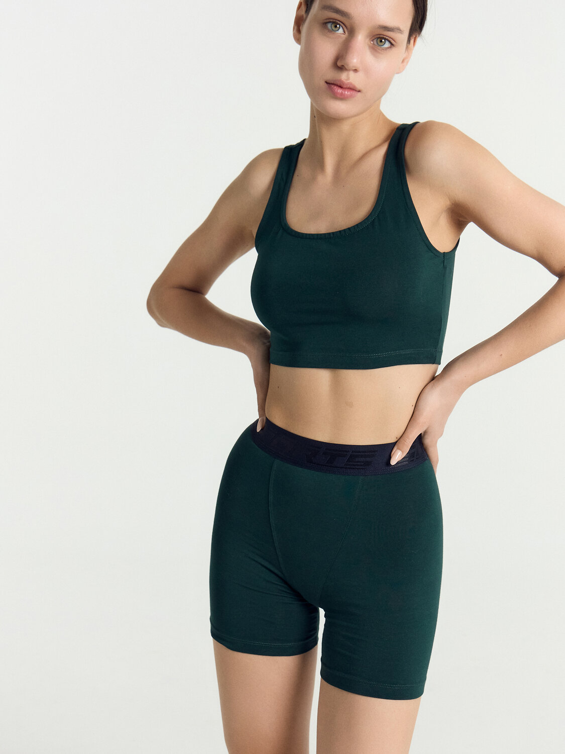 Комплект женский состоит из топа и шорт. Топ прилегающего силуэта. Перед и спинка цельнокроенные. Горловина формы каре. Горловина и проймы обработаны в чистыфй край, нижний срез обработан швом в подгибку. Шорты облегающего силуэта. По переду декоративная отрезная деталь, имитация "гульфика". По верхнему срезу настрочена жаккардовая эластичная тесьма. Нижние срезы обработаны швом вподгибку.