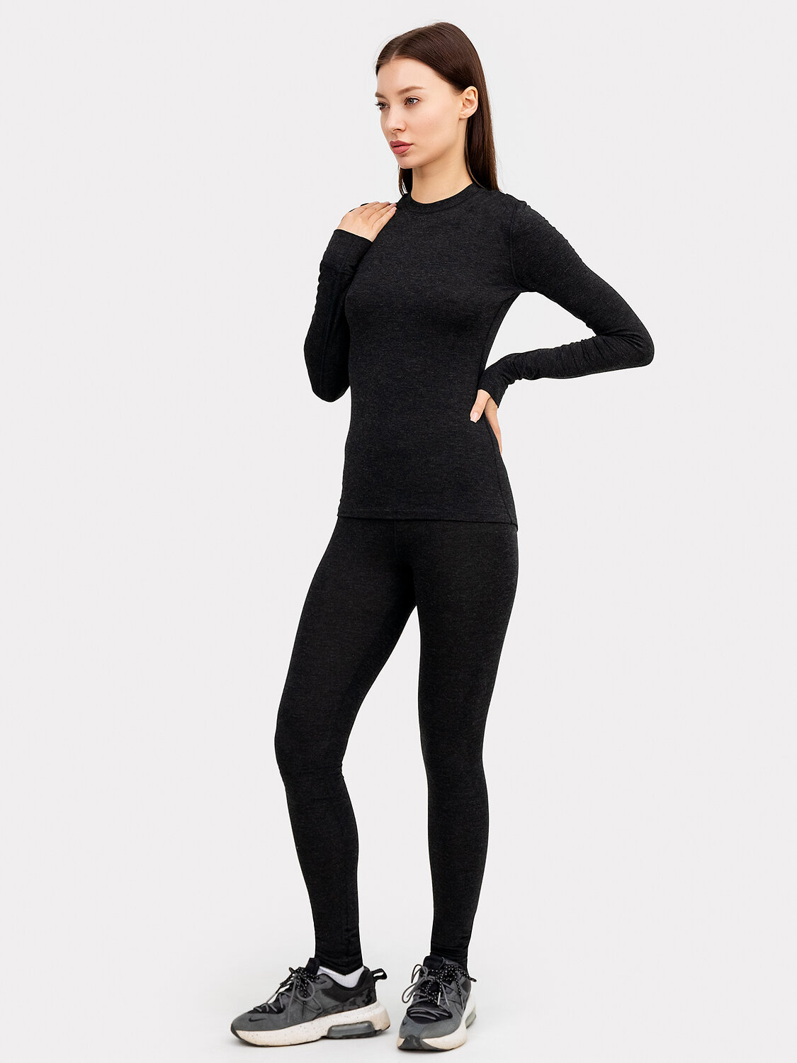 Легинсы плотно облегаюшие бедра и ноги по всей длине. Без боковых швов, с высокой линией талии и цельнокроенным поясом, с эластичной резиной внутри.