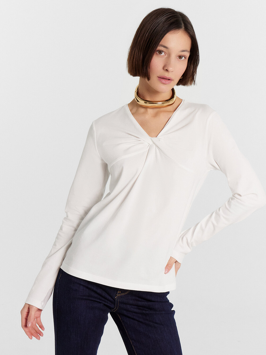 Этот изящный лонгслив прекрасно дополнит ваш гардероб. Он изготовлен из нежной кулирки, что обеспечивает мягкость, эластичность и комфорт при носке. Натуральный материал позволяет коже дышать, не вызывая раздражений, и сохраняет свою форму даже после многократных стирок. Модель имеет прямой силуэт и V-образную горловину с деталью в виде перекрута, добавляющую уникальности. Длинные рукава придают образу элегантность и утонченность. Женский лонгслив от Mark Formelle станет отличным выбором для создания стильных и изысканных образов на каждый день.