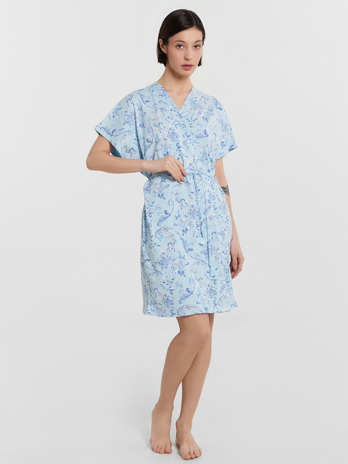 Хлопковый женский халат с короткими рукавами. Модель запахивается и дополнительно фиксируется с помощью тонкого пояса с декоративными кисточками. Длина халата чуть выше колена. Уютно и стильно!