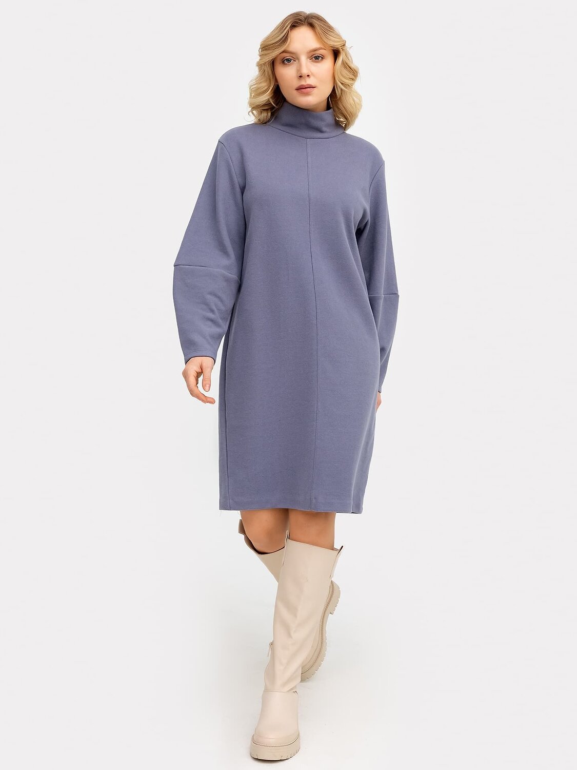 Однотонное женское платье прямого силуэта из селаника – невероятно нежного и приятного к телу трикотажного полотна. Вырез круглой формы, с воротником-стойкой. На спинке застегивается на потайную молнию. Спереди проходит интересный центральный шов. Рукава платья длинные и объемные, с горизонтальным швом примерно по центру. Длина модели – по колено. Рекомендуем для стильных образов на каждый день!