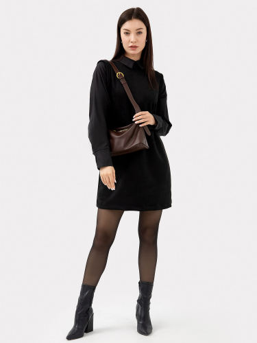 Платье прямого силуэта из трикотажного полотна селаник. Горловина круглой формы с воротником-стойкой. На детали спинки центральная застежка на потайную молнию и обработан разрез. На детали переда вытачки от бокового шва. Рукав втачной длинный.