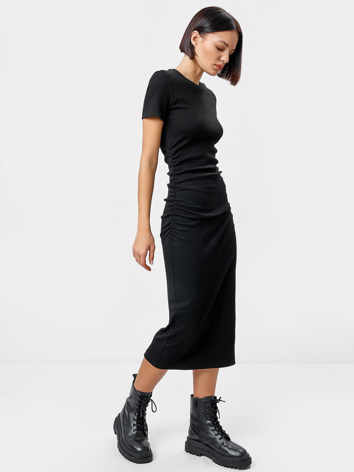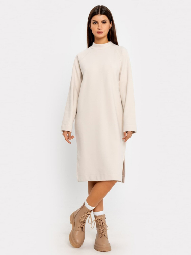 Платье-футляр из рибаны, облегающего силуэта. Втачной рукав до середины плеча с небольшой свободой. Круглая горловина, плотно прилегающая к шее, обработана отрезной обтачкой из основного полотна. Шов втачивания обтачки на участке горловины спинки окантован и отсрочен на спинку. От боковых срезов на переде и спинке от проймы до линии бедер расположена сборка, собранная на эластичную тесьму. Длина изделия ниже колена. Подгибка рукава и низа изделия обработаны на плоскошовной машине.