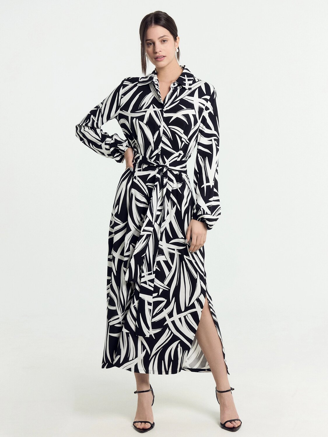 Платье с широким поясом прямого силуэта из ткани. Горловина кргулой формы с втачаным воротником. По переду центральная застежка на пуговицы. На деталях переда и спинки вытачка заложена в одностороннюю складку. Рукав втачной, длинный, по низу подгибка с эластичной тесьмой внутри, образует сборку. В боковых швах обработаны разрезы. Платье длиной ниже колена.
