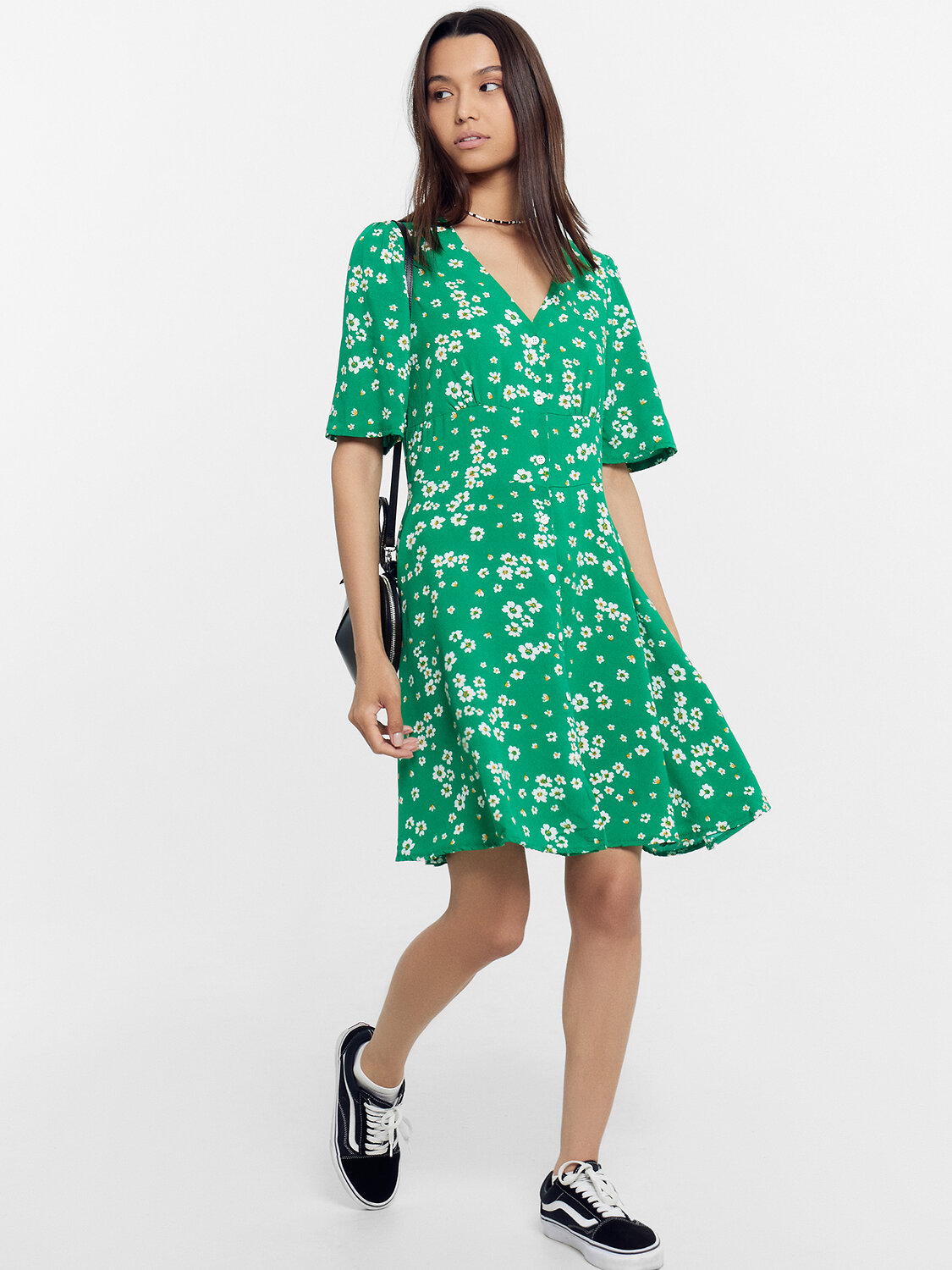 Нижняя часть платья с расклешением. Длина выше колен. Низ платья и рукавов обработан швом вподгибку.