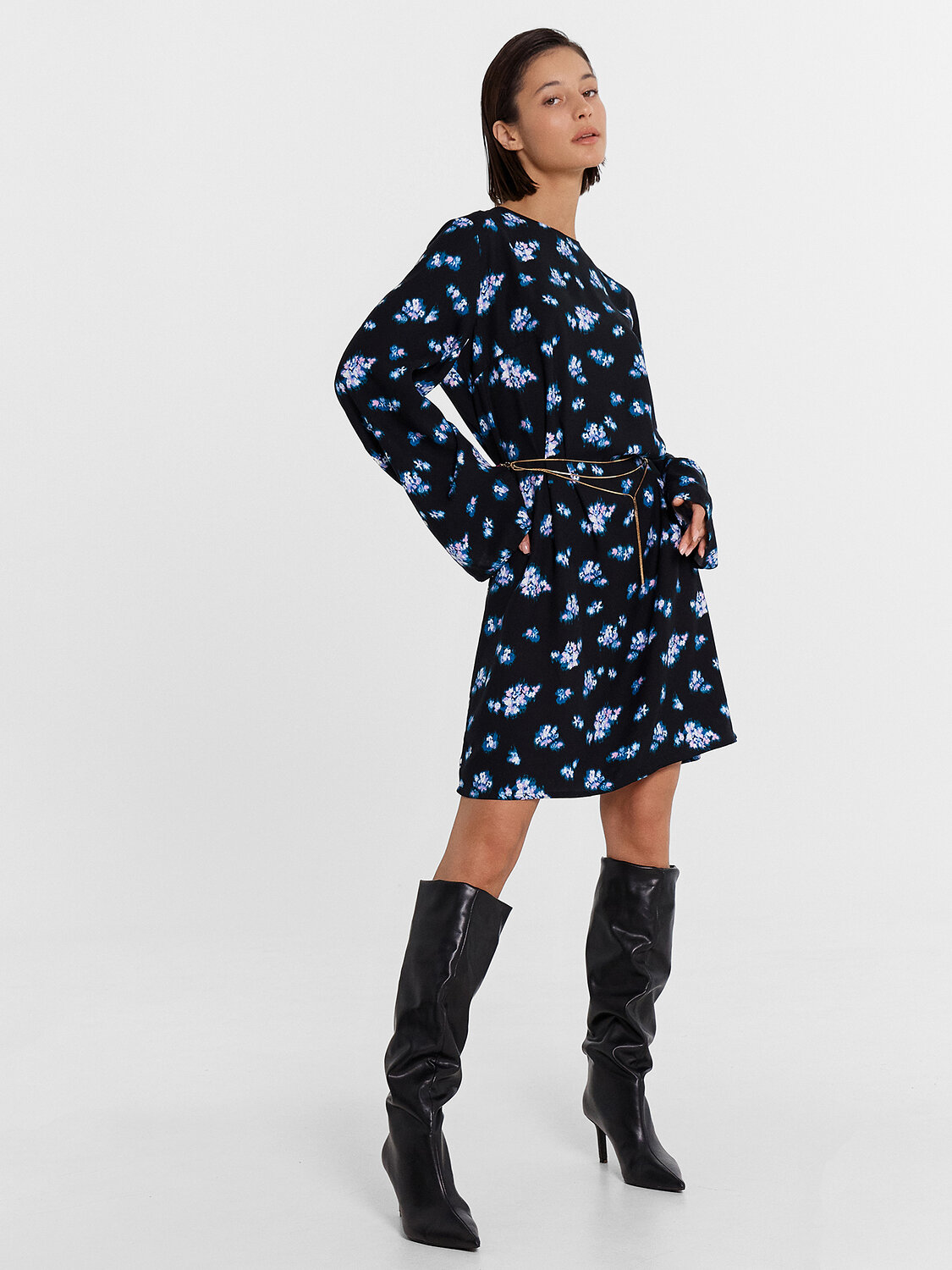 Платье прямого силуэта. Горловина круглой формы, обработано бейкой из основного полотна в "чистый край". Рукав втачной, длинный. На детали переда застрочены вытачки. Спинка со средним швом и застежкой на потайную молнию. Нижний срез платья и рукавов обработан швом вподгибку с закрытым срезом.