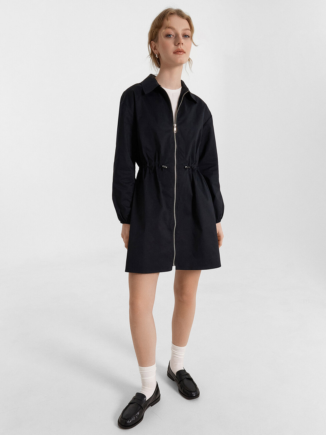 Эффектное мини-платье свободного кроя разнообразит ваш гардероб. Изготовленное из смесового хлопка, оно сочетает в себе комфорт и современный стиль. Стояче-отложной воротник и длинные рукава придают образу изысканность, а спущенная линия плеч гарантирует свободу движений. Присборенная талия подчеркивает фигуру и создает женственный силуэт, а центральная застежка на молнию обеспечивает удобство. Это платье идеально подойдет для любого случая, добавив вашему гардеробу нотку элегантности и удобства. Данная модель предназначена для эпизодического использования.