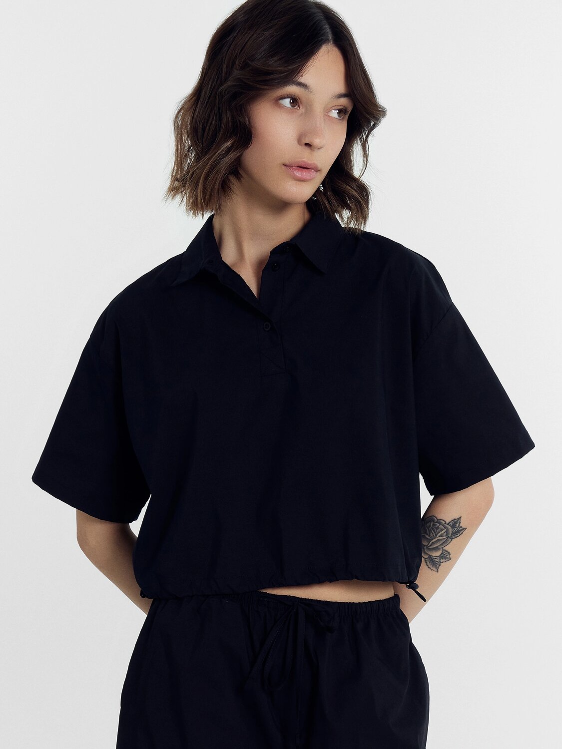 Блузка слегка укорочена, по низу подгибка со шляпной резиной внутри и фиксаторами по боковым швам.