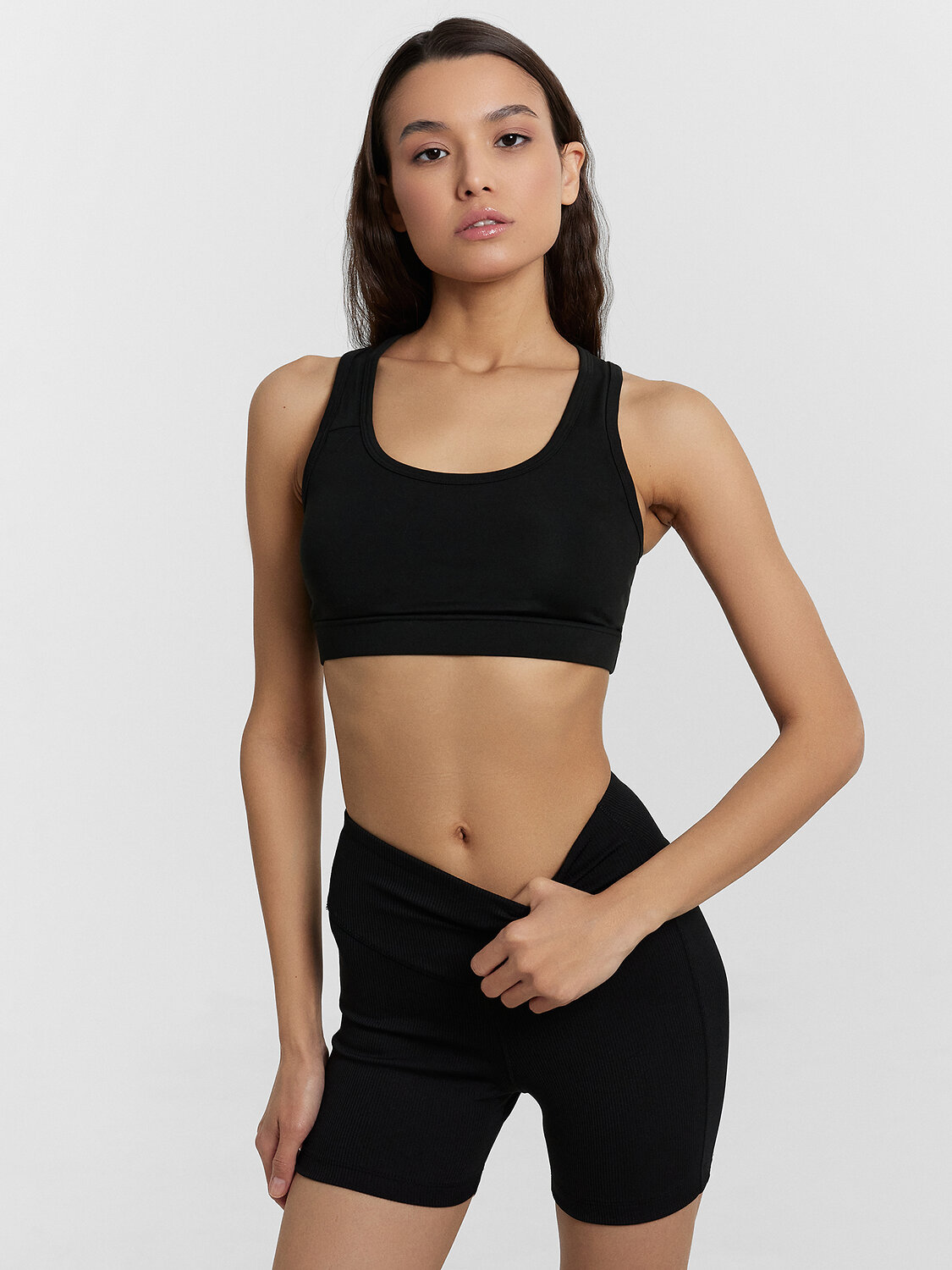 Короткие шорты из трикотажного интерлока. Силуэт облегающий, линия талии – высокая. Широкий фигурный пояс с эластичной тесьмой внутри дарит абсолютный комфорт. Боковые швы перенесены вперед. Нижние срезы подогнуты. Отличные шорты для спорта и активного отдыха!