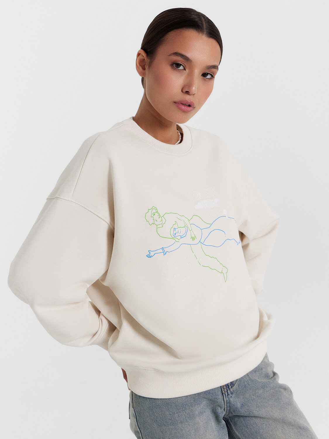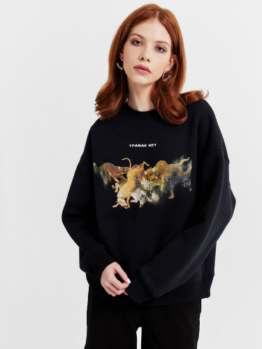 Джемпер (свитшот) oversize, перед и спинка цельнокроенные, длиной до линии бедер.